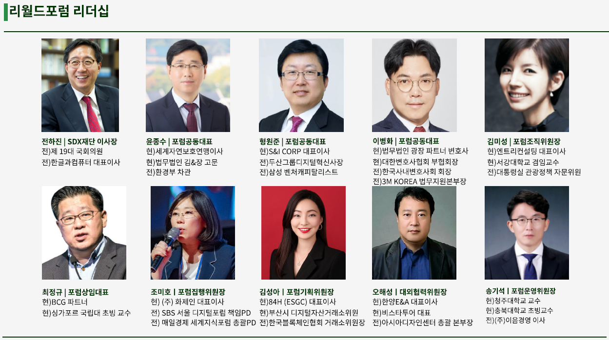 리월드포럼은 현재 3인의 공동대표 및 1인의 상임대표를 중심으로 사무국과 공식파트너사, 공동주관사, 미디어파트너사 등의 다양한 형태의 기관 및 기업, 단체 등과 협업을 통해 기후위기 대응을 위한 영향력있는 포럼으로 발전해 나갈 예정입니다.