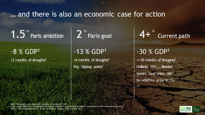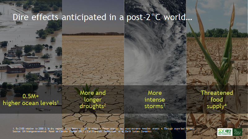 UN IPCC에 따르면 지금대로 지구온도가 상승한다면 2100년에는 약 4도가 증가할 것으로 예측되며 이렇게 되면 전 세계 GDP의 30%가 감소하고, 10개월 이상의 가뭄에 시달리면서 뉴욕 등 저지대 도시는 바다에 잠기게 될 것으로 내다 봤다. 미국의 산불도 지금의 6배에 달 할 것으로 예측했다. 앞으로 70년 쯤 후라면 지금 태어난 우리 아이들이 살아가야 하는 세상이다. 파리기후협약에 의해 설정한 1.5도는 이미 물 건너 간 듯하다. 아마도 앞으로 10년 안에 1.5도에는 도달하게 될 것이고, 백번 양보해서 2도 상승을 저지하는 것은 인류 생존에 마지노선이라고 할 수 있는데 이미 이 조차도 달성하기가 어렵다는 예측이다.