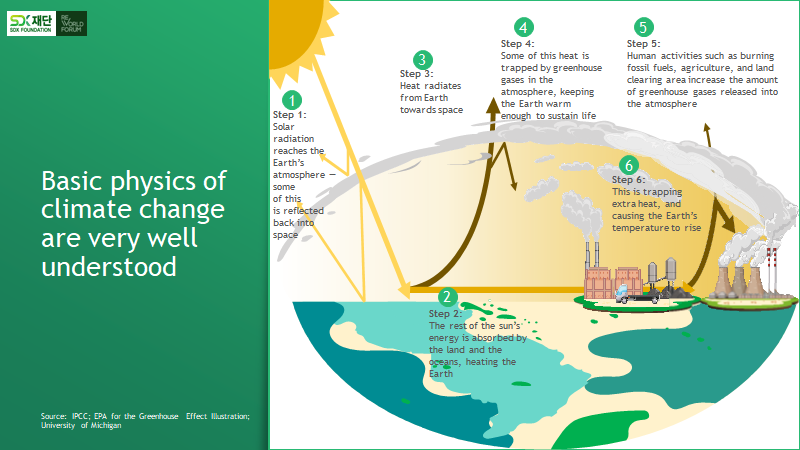 요즘 우리는 연일 세계 도처에서 발생하는 이상 기후현상을 접하고 살아가고 있다. 우리도 예외는 아니어서 전국에서 물 폭탄 때문에 많은 인명 피해는 물론 생활 터전이 파괴되는 아픔을 겪고 있다. 문제는 이것이 갈수록 더욱 격해지고 있음에도 불구하고, 국제사회는 이에 대처하는 시나리오조차 갖고 있지 못하다는 것이다. 파리기후협약에 의해 대부분의 국가가 온실가스 감축을 약속하고 그 계획을 내 놨지만 이를 전부 합쳐도 지구 온도 상승을 막기엔 역부족이다. 현재 지구 온도는 최소한 1만 2천년 안에 가장 높은 온도를 기록했다.