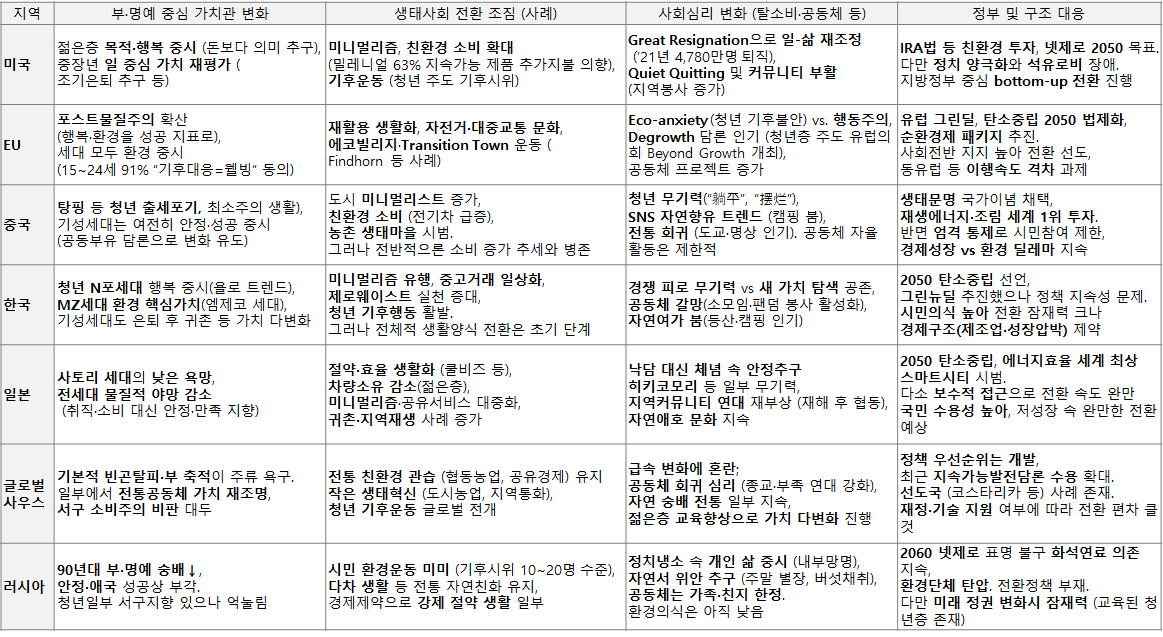 △무기력, 탈소비주의, 공동체 회귀, 자연 중심 가치의 부상 등 사회심리적 변화 양상,