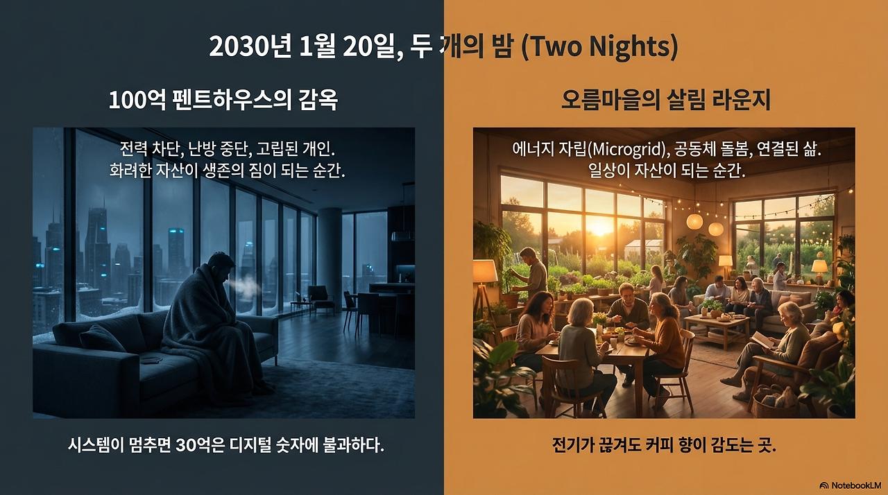 상상해 보십시오. 사상 유례없는 한파로 국가 전력망이 블랙아웃된 서울의 어느 겨울입니다. 100억 원을 호가하는 강남의 펜트하우스는 전기가 끊기는 순간, 40층을 오르내려야 하는 거대한 고철 덩어리이자 감옥으로 변합니다. 통장에 찍힌 30억은 디지털 숫자에 불과할 뿐, 물 한 컵, 밥 한 끼 해결해주지 못합니다.