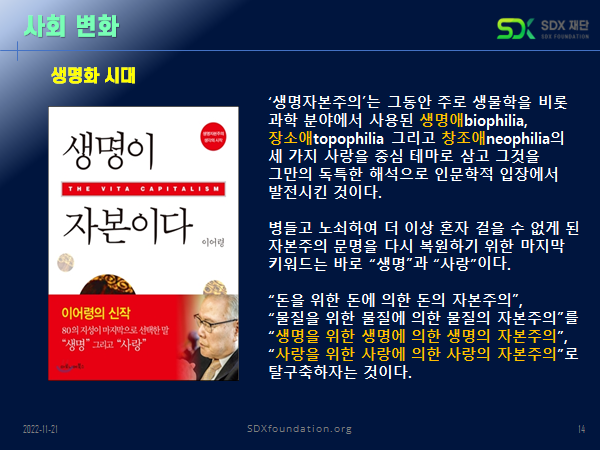 그래서 다시 금 이어령 선생님의 생명자본주의가 가슴에 와 닿습니다. 물론 이어령 선생님뿐만 아니라 전 세계 많은 석학들이 자본주의의 종말을 예견하고 ‘이타적 경제주의’라든가 ‘창조적 자본주의’ 등 다양한 용어를 빌려 새로운 상식을 주문하고 있습니다.
