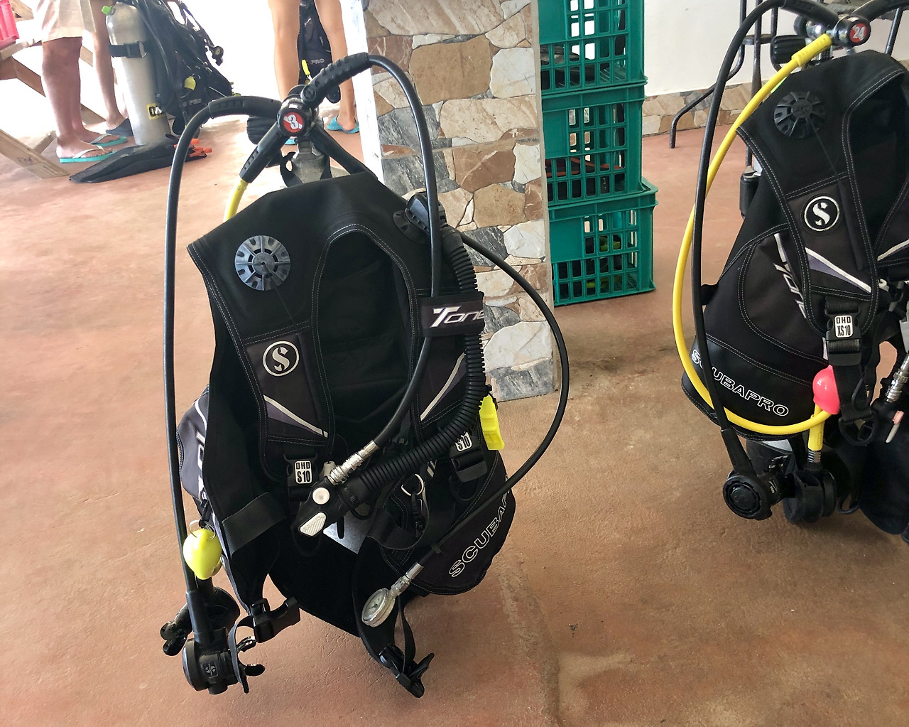 이어진 교육에서는 장비를 직접 만져보며 사용법을 배웠다. 가장 신기한 장비는 BCD라고 부르는 부력 조절 장치(Buoyancy Compensators Device)였다. 전신 슈트 위에 입는 일종의 조끼인데 이를 통해 부력을 조절한다. 이 장비에 실린더를 연결하고 공기를 주입하거나 빼면서 부력을 조절한다고 했다. 수중에서 사용할 수 있는 많은 추가 장비를 달고 있었다. 실린더의 상태를 알려주는 잔압계, 보조 호흡기가 주된 장비다. 대략적인 설명을 듣고 곧장 수영장으로 이동했다.