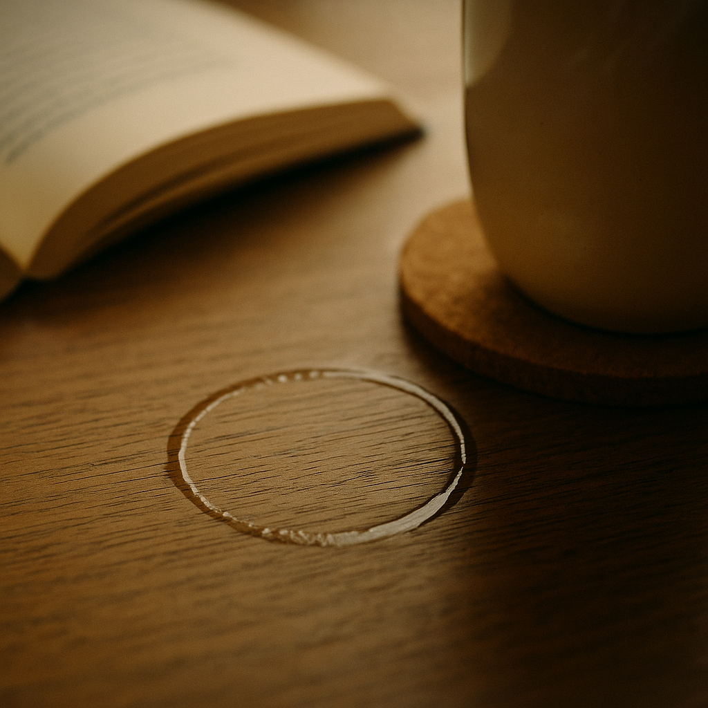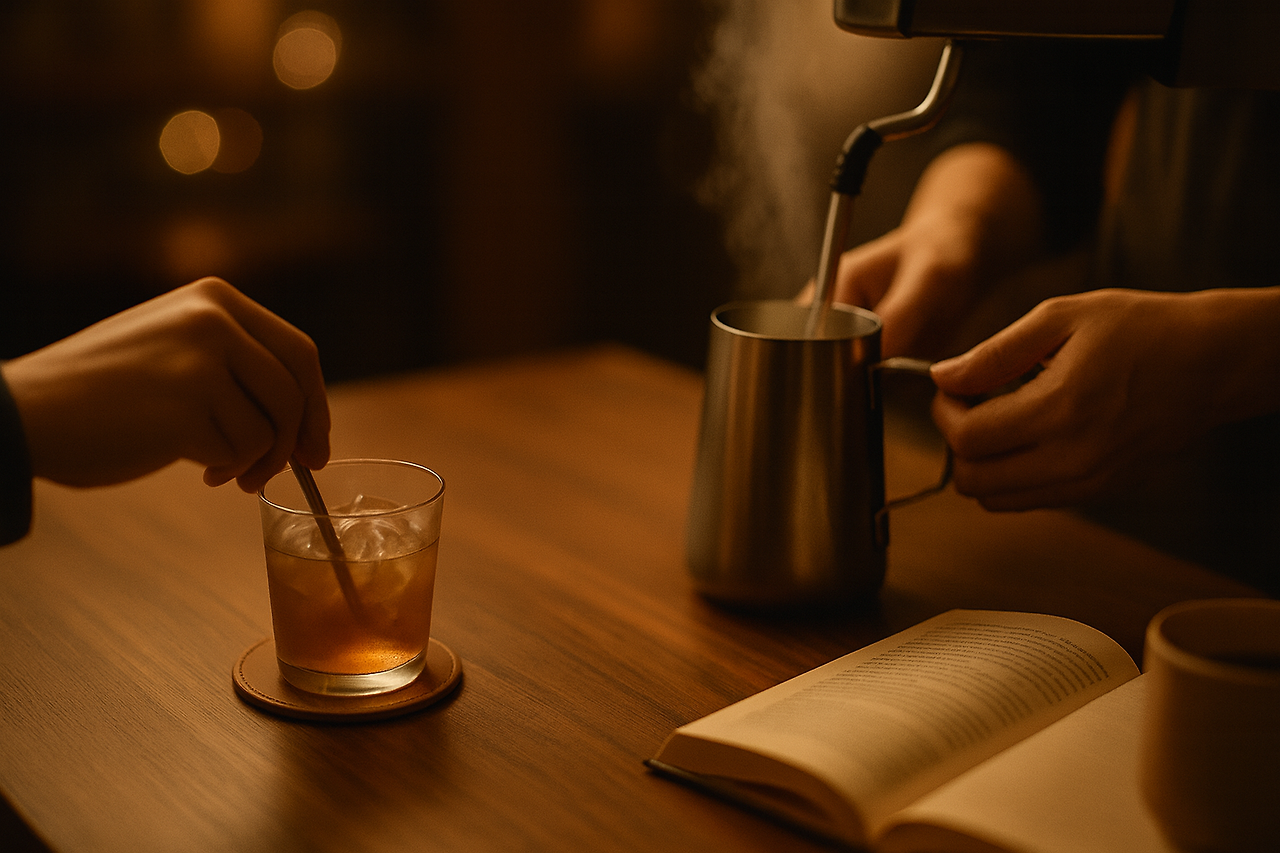 누군가의 트레이가 내 테이블 모서리를 스치며 지나간다. 흐름이 다시 움직이기 시작한다. 나는 컵을 들어 남은 한 모금을 천천히 비우고, 코스터 위의 마지막 물자국을 눈으로 담는다. 모서리에서 멎었던 시간이 다시 거리로 흘러가도, 원의 흔적은 잠깐 남는다. 그 잠깐이 오늘 내가 고른 문장이다.