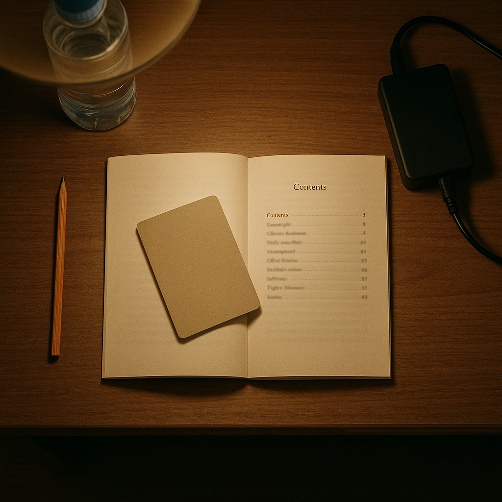 표지—차례—첫 단락. 낯선 곳에서의 밤에는 늘 이 순서를 따른다. 표지를 손바닥으로 한 번 쓸며 오늘 하루의 속도를 맞춘다. 차례를 넘기며 어디까지 왔는지, 어디로 갈 건지 가볍게만 확인한다. 그리고 첫 단락. 오늘은 많이 읽지 않는다. 길게 이해하지도 않는다. 대신 시작을 정확히 한다. 시작이 정확하면 낯선 방도 익숙한 듯한 공기가 느껴진다.