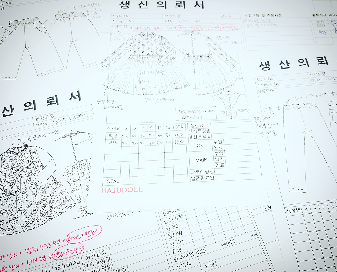 작업지시서는 디자인된 아이템 마다 생산 작업지시를 내리는 설명서라 할수 있습니다