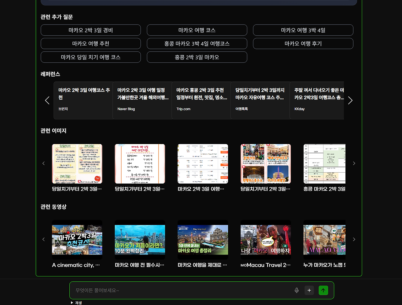 의도 분석 하여 여행이 의도라면 한 번에 다양한 정보를 보여주는 기능을 강화하였습니다. 통합 서칭 기능이라 로그인 없이 검색 가능합니다. 검색창에 가고 싶은 여행지를 검색하시면 다음과 같이 한 번에 모든 정보가 나오고 호텔이나 항공편을 클릭하면 연결될 수 있도록 하였습니다.