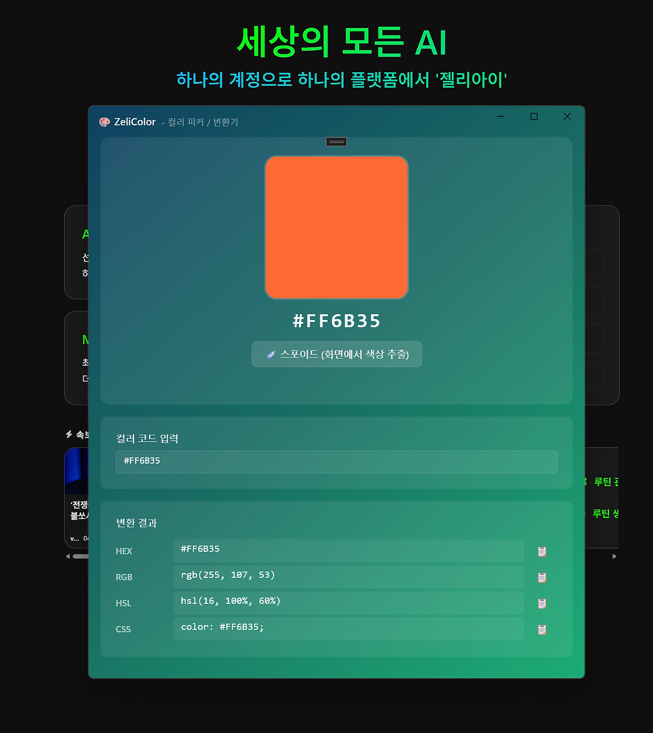 스포이드를 이용하면, 화면에 있는 컬러를 가져올 수 있습니다. 사실, 내부에서만 사용하려던 유틸리티입니다. HEX 값은 디자이너, 개발자의 영역이었습니다. 최근 모든 분야의 종사자께서 점점 이 영역으로 오시기에 유틸리티로 넣게 되었습니다.