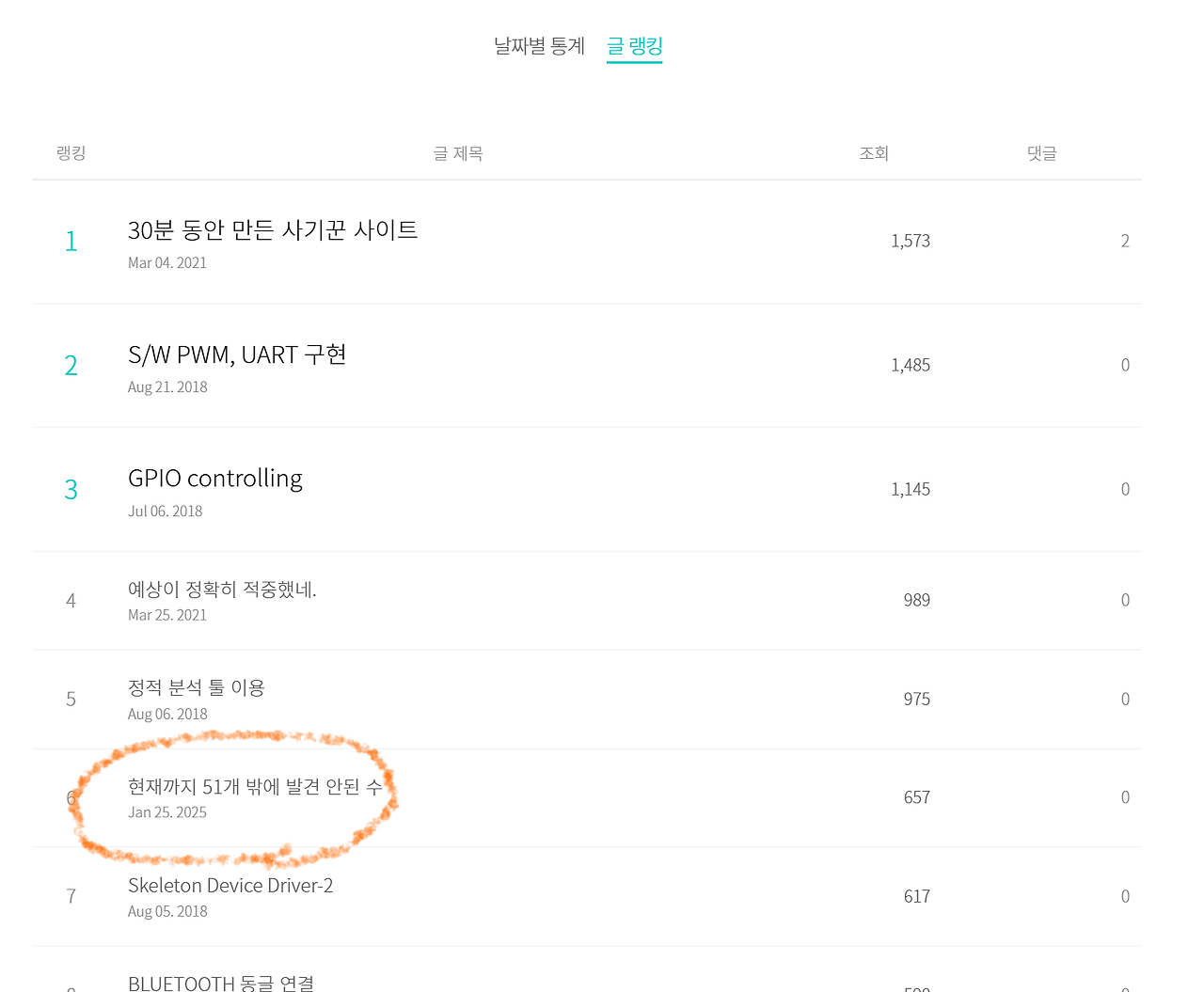 브런치에도 통계 시스템이 되어 있으니 살펴보다. 25년 쓴 글이 내 글 랭키에서 10위권 안에 진입을 했다.