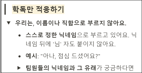 처음에는 닉네임과 함께 존댓말을 사용하려니 어색했는데 이제는 너무 익숙해졌고, 확실히 직급없이 닉네임으로 부르는 것이 동료(선후배 개념조차 없다!)간의 동등한 관계를 형성하는 데 도움이 되었다.