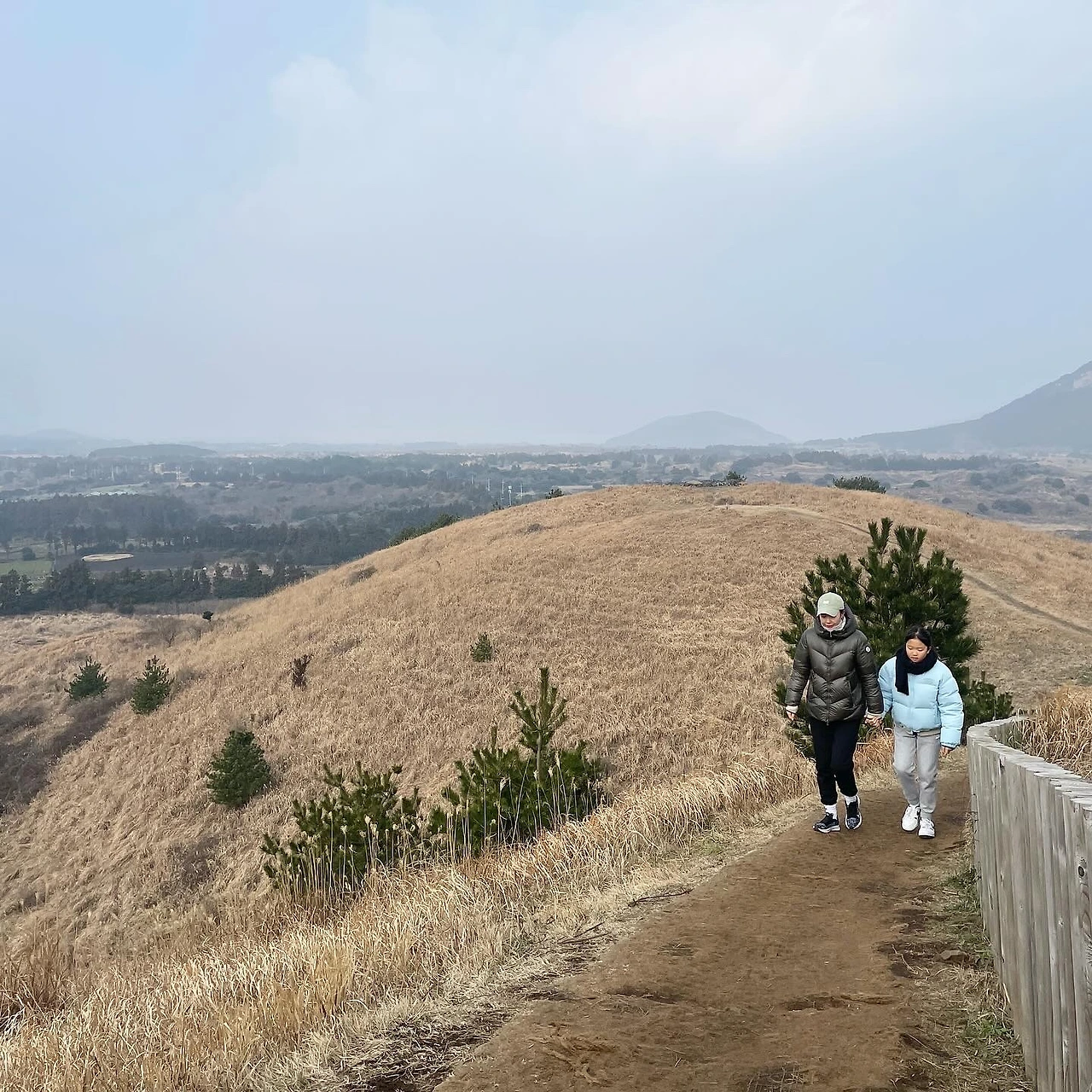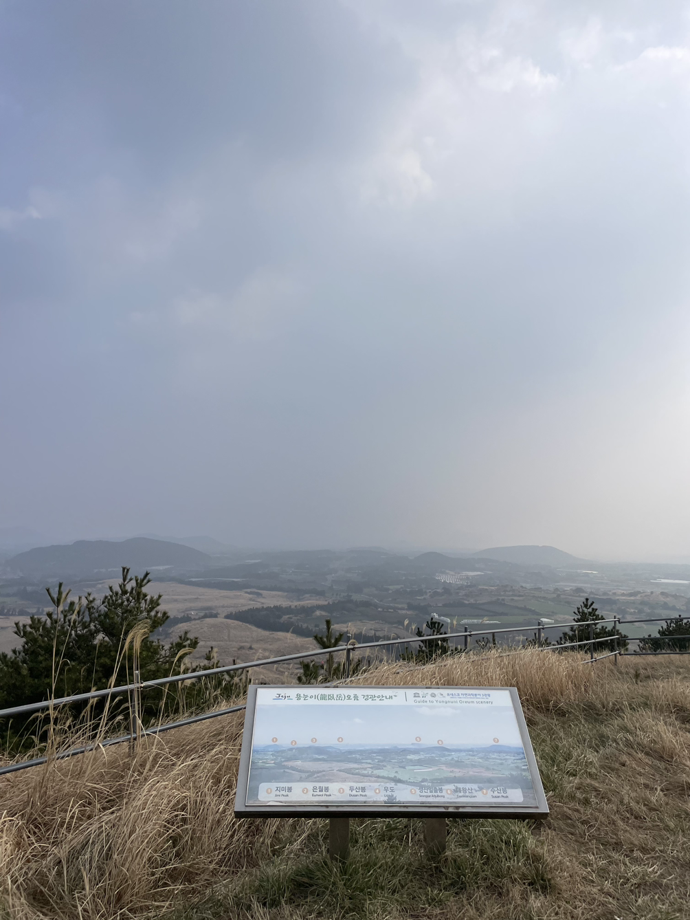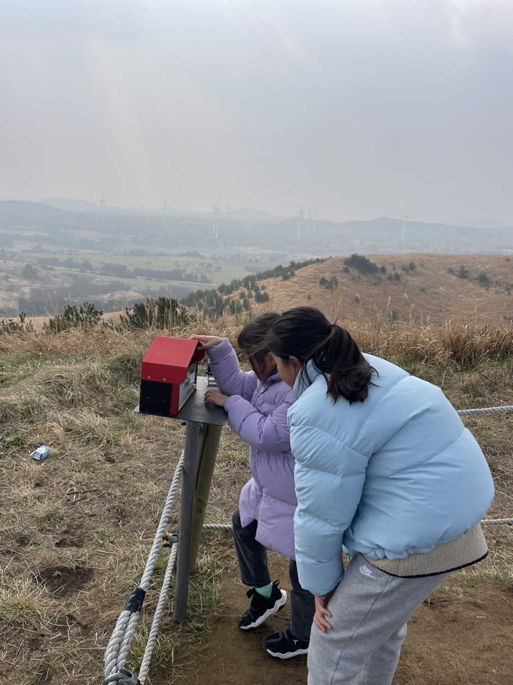 큰아이는 아빠손, 둘째는 엄마손을 잡고 천천히 걸었다. 경사를 낮춰 멀리 돌아가도록 짜놓은 산책로가 가족들과 도란도란 이야기하며 걷기 좋았다. 바람이 정면으로 부는 마지막 경사를 오르며 흐리지만 주변 오름들도 볼 수 있어 좋았다. 이름도 예쁜 다랑쉬오름과 아끈다랑쉬오름은 다음 기회에 올라보기로.