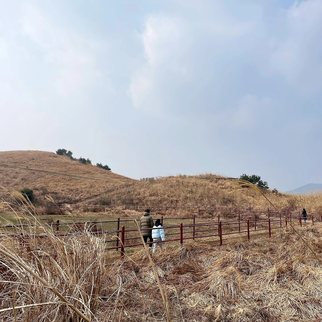 오름을 배경으로 한 마방목지에서 유유자적 풀을 뜯고 있는 말들의 모습이 제주에 살면서도 문득 '여기가 제주구나' 하는 생각을 하게 한다. 능선이 아름답기로 소문난 용눈이오름은 입구에서 정상까지 탐방로를 따라 오름을 바라보며 걸을 수 있게 안내되어 있다. 중간중간 말이 지나가지 못하도록 통로가 막힌 곳이 있어 우리는 미로를 지나가듯 통과했다. 겨울이기에 초록의 잔디는 아니지만 억새들의 물결이 바람에 흔들리고 있는 능선은 평화롭고 아름다웠다.
