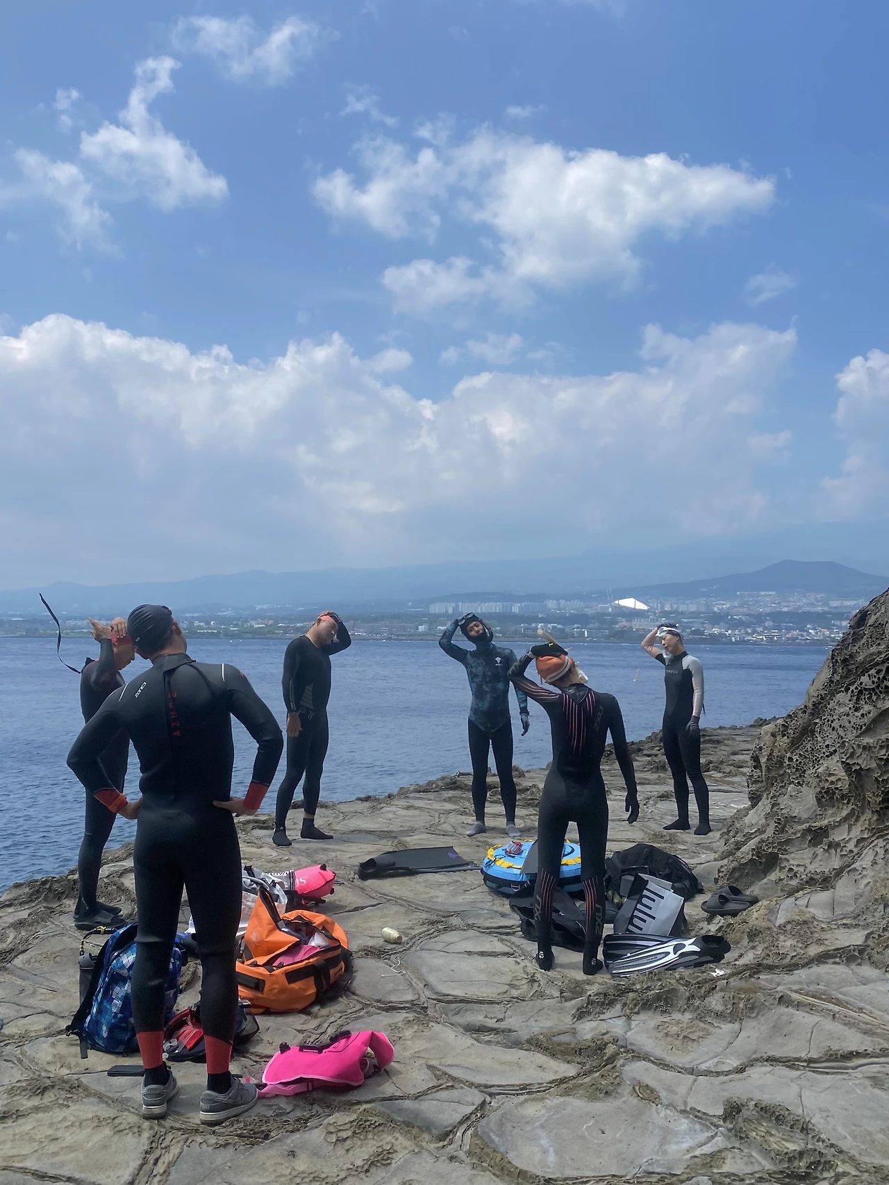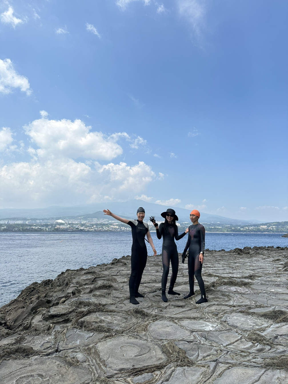 한 달 전 다이빙 잠수풀에서 두 번의 테스트 후 다이버들의 성지인 범섬에서 우리 아이다팀의 첫 경주가 시작됐다. 큰 호랑이가 웅크리고 있는 모양을 닮아 범섬이라 이름 지어졌는데 옆의 문섬, 섶섬과 함께 천연기념물로 지정되어 있다.