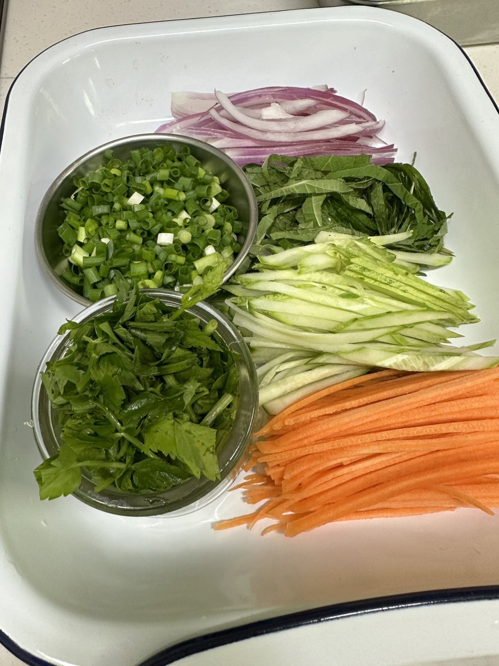 1. 오이, 깻잎, 당근, 적양파를 가늘게 채 썰고 미나리와 쪽파를 작게 썰어놓는다.