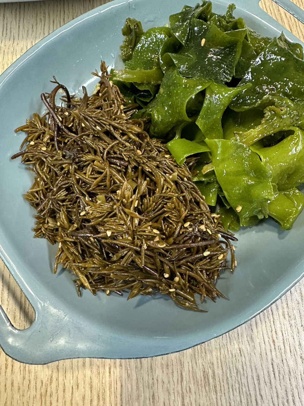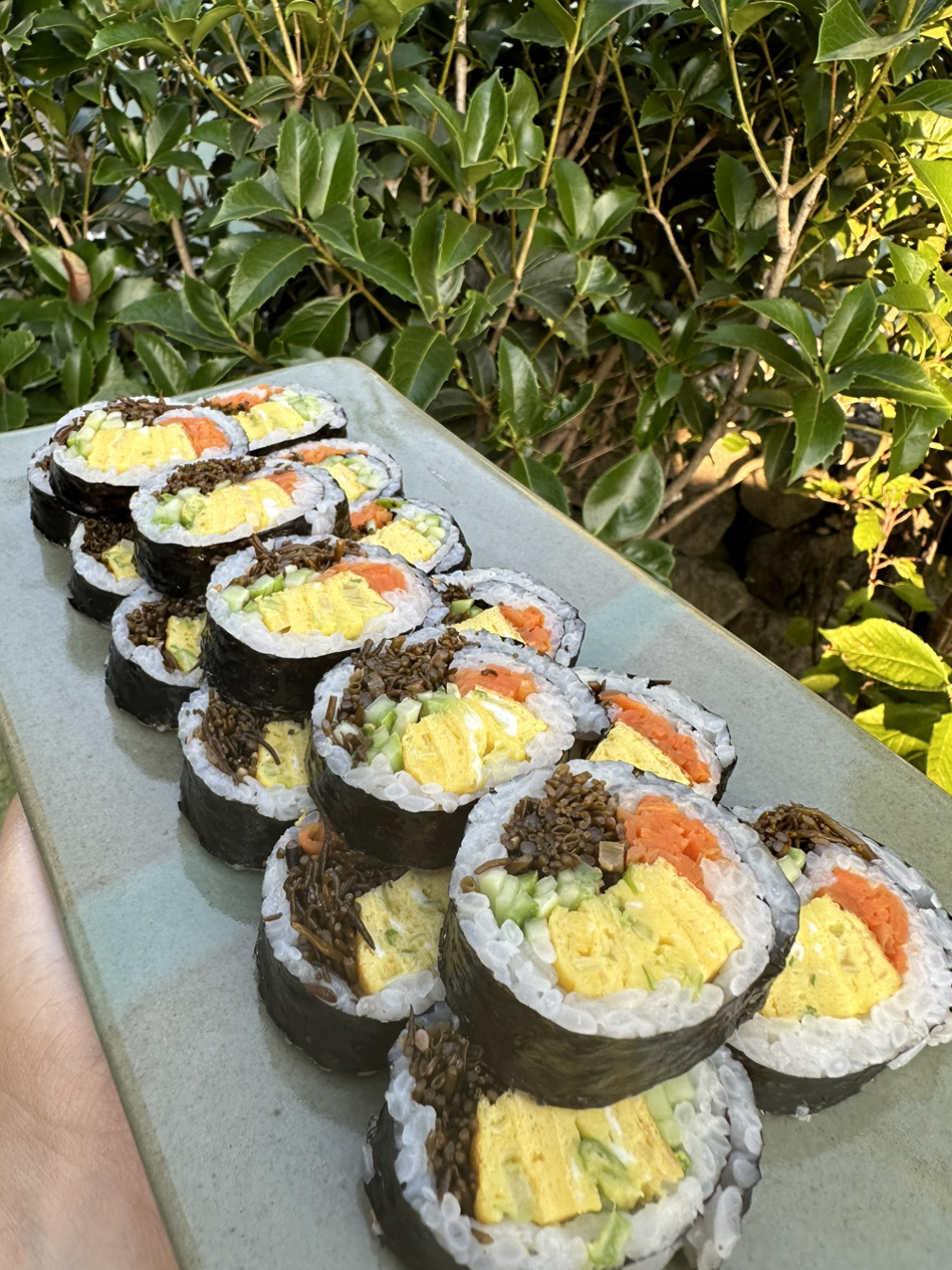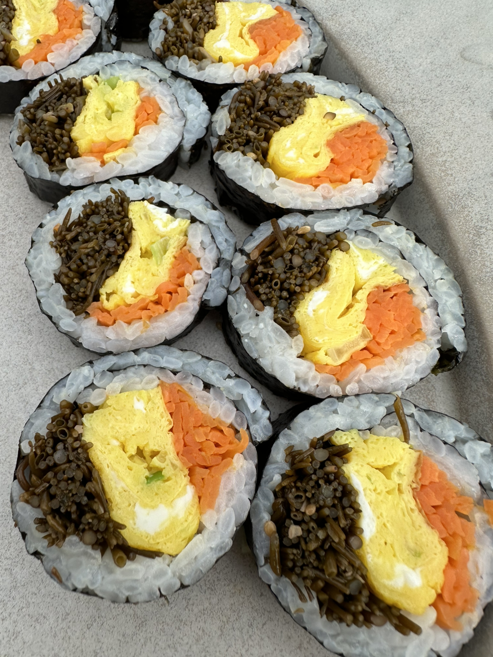 톳조림이 입에서 터지는 소리다. 제주에 와서 친숙해진 식재료 중 하나인 톳은 김밥 속재료로 넣었을 때 매력이 더 올라간다. 서울에서 자주 가던 김밥집의 시그니처 메뉴가 꼬시래기 김밥이었는데 바로 거기에서 영감을 얻었다.