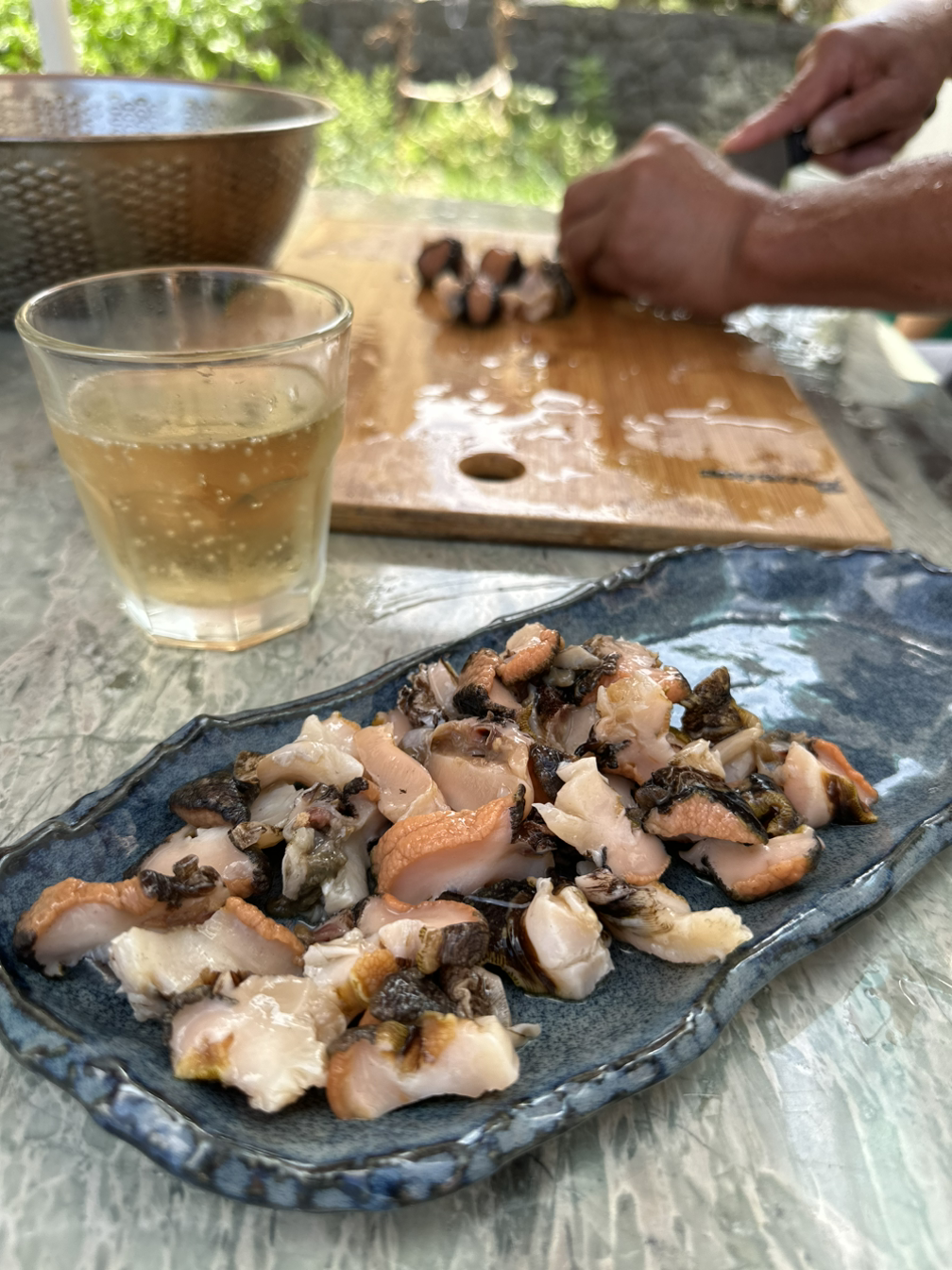 한 명은 망치로 소라껍데기를 깨고 한 명은 내장과 이빨을 제거하고 한 명은 깨끗이 씻어 얇게 썬다. 일사불란하게 분업이 진행되고 어느새 접시 가득 쌓인 뿔소라는 바다를 통째로 먹는 것처럼 싱싱하다.