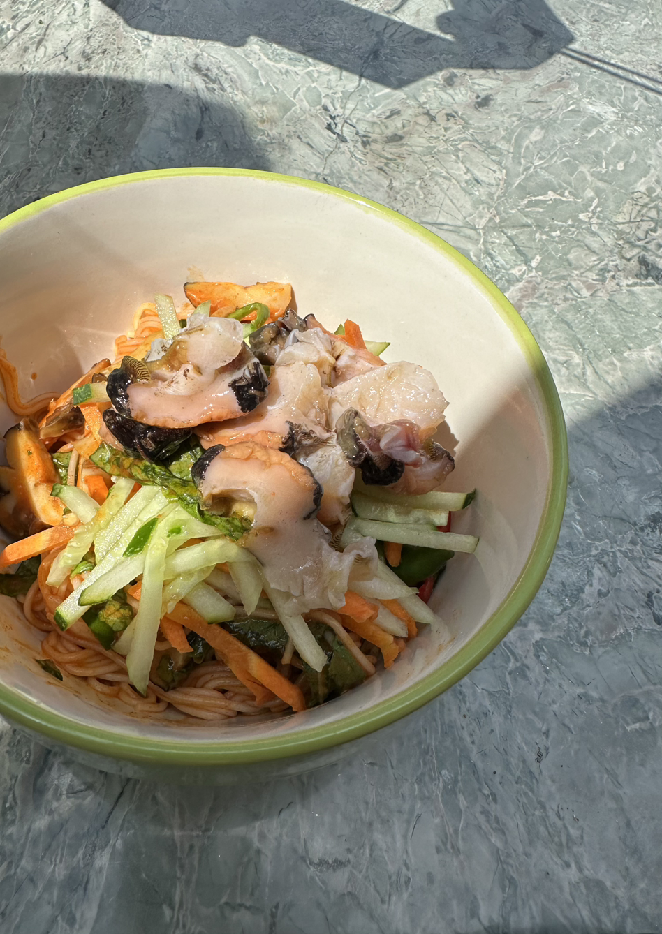뿔소라의 회를 어느 정도 먹으니 다음 코스 비빔국수가 나온다. 당근, 오이, 깻잎, 양파, 홍고추, 청고추를 얇게 썰고 삶아놓은 뿔소라와 탱탱한 소면을 초고추장 양념에 버무리면 새콤달콤한 향에 입에 침이 고인다.