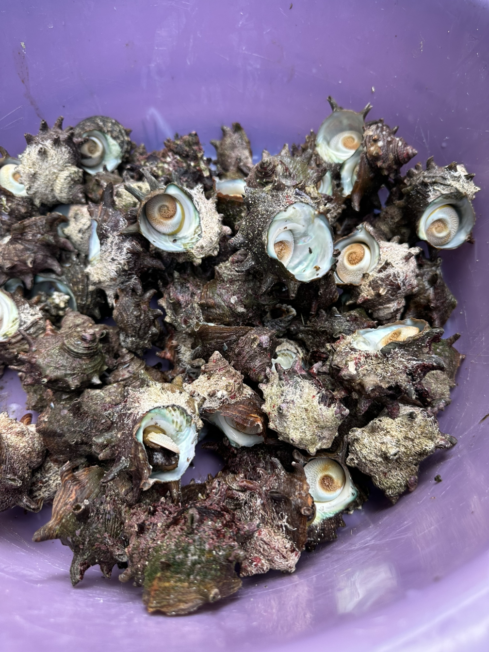아직 따뜻한 바다에는 해파리와 해파리의 잔해(따꼼이)들이 남아있지만 이젠 슈트와 장갑과 복면으로 무장한 채 겁 없이 들어간다. 바닷속 여(큰 바위) 가까이로 가 돌틈과 바닥 쪽을 살피다 보면 뿔소라의 뾰족한 꼭지가 눈에 들어온다. 작년에는 바다에서 헤엄치랴 숨 쉬랴 바빴기 때문에 소라를 찾을 겨를도 없었는데 옆에서 맛보라고 주는 소라는 바다에서의 긴장감을 녹여주는 치료제 같았다.