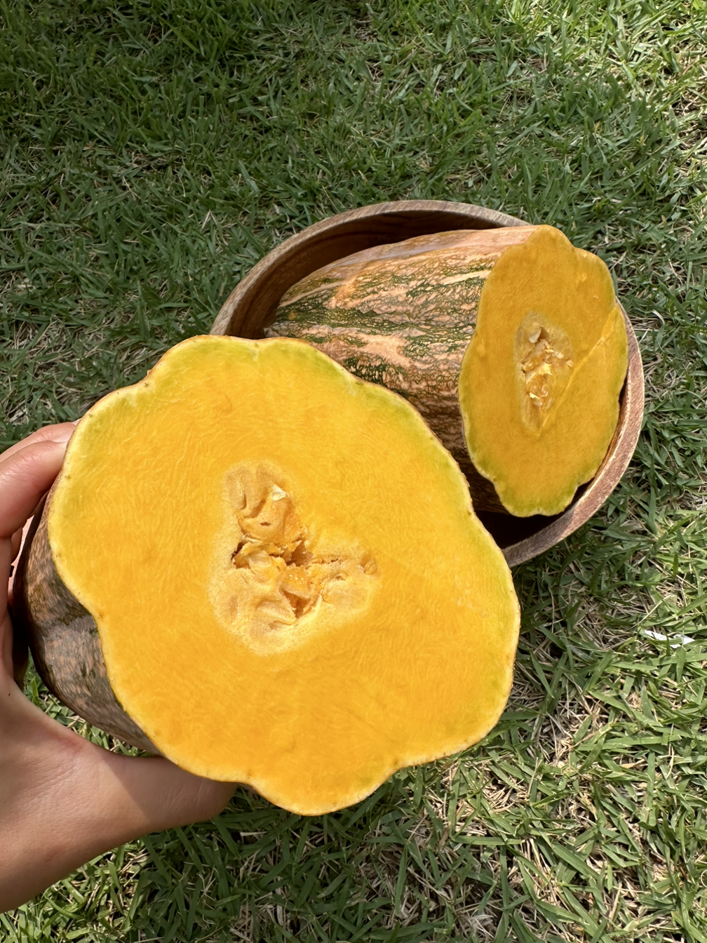 2. 호박을 깨끗이 씻어 반으로 갈라 씨를 빼고 껍질을 벗긴다.