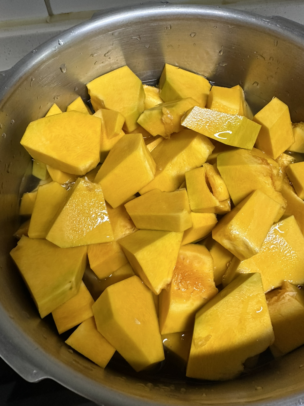 3. 적당한 크기로 썰고 물을 넣어 압력솥으로 쪄낸다.