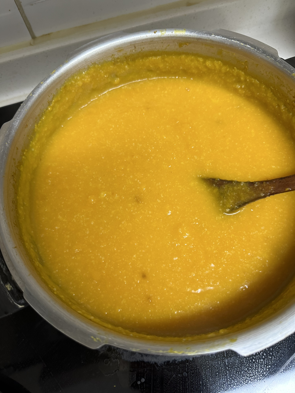 4. 푹 익은 호박을 으깨고 갈아놓은 찹쌀을 물과 함께 넣어가며 농도를 맞춘다. 뚜껑을 닫고 중불로 한번 더 익혀준다.