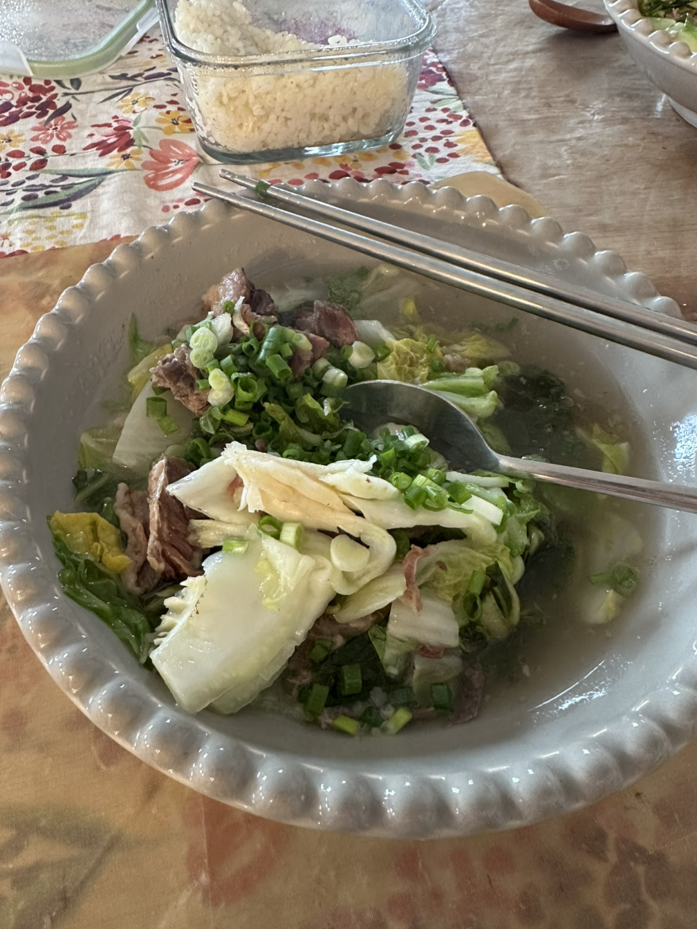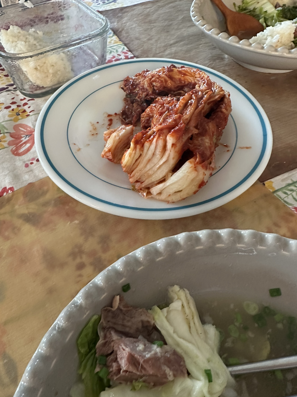2차전 백김치를 하기 전 점심밥을 먹으며 잠시 숨을 돌렸다. 언니가 압력솥으로 끓인 갈비탕은 노곤한 몸을 싹 풀어주었다. 방금 담근 김치도 손으로 쭉쭉 찢어가며 먹으니 이 정도 새참이면 김장 열 번도 더 하겠네?! 하며 국물까지 싹 비웠다.