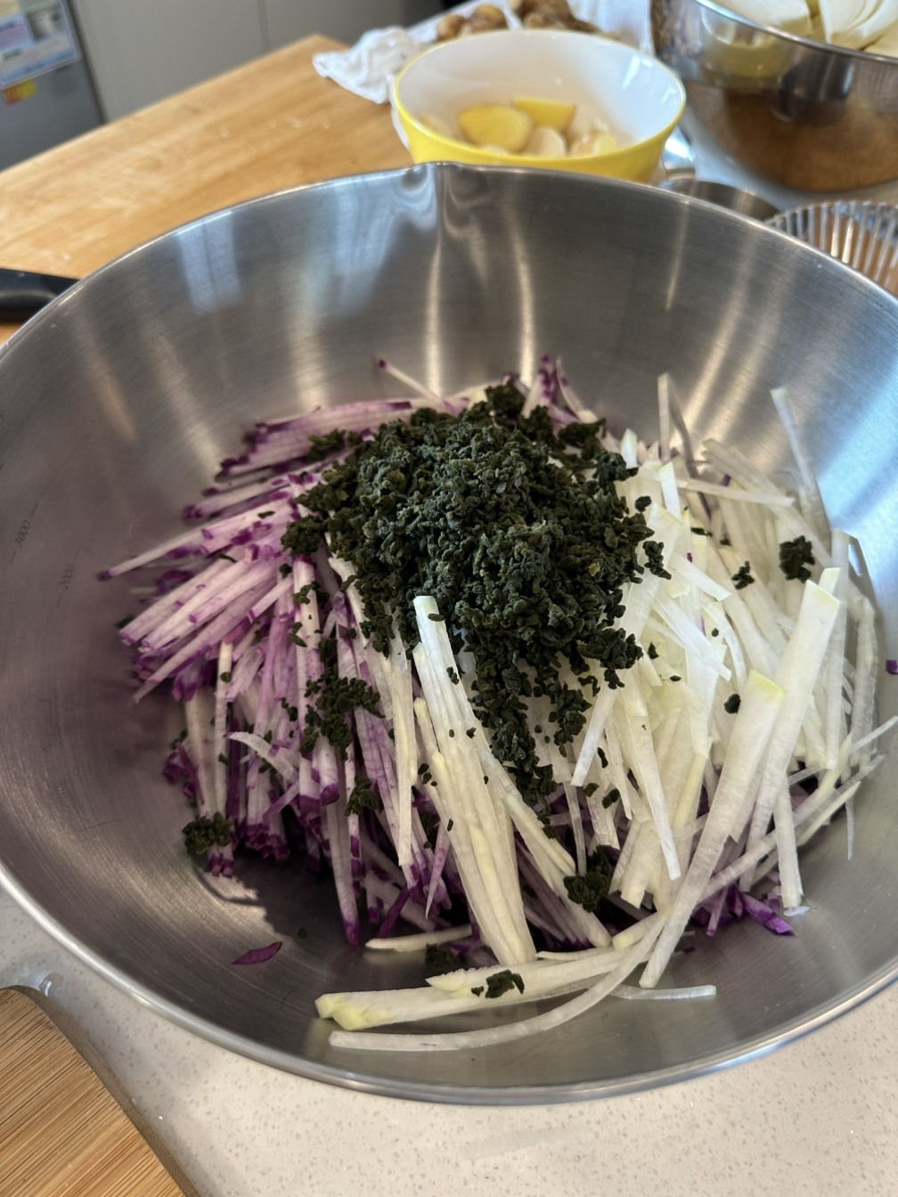 백김치를 위해 남겨놓은 배추에 하얀 양념을 묻히고 채 썬 마늘과 쪽파를 올려 육수를 부어주었다. 크게 썰어 넣은 사과와 양파, 생강 두 조각은 국물의 맛을 더욱 깊이 있게 만들어준다.