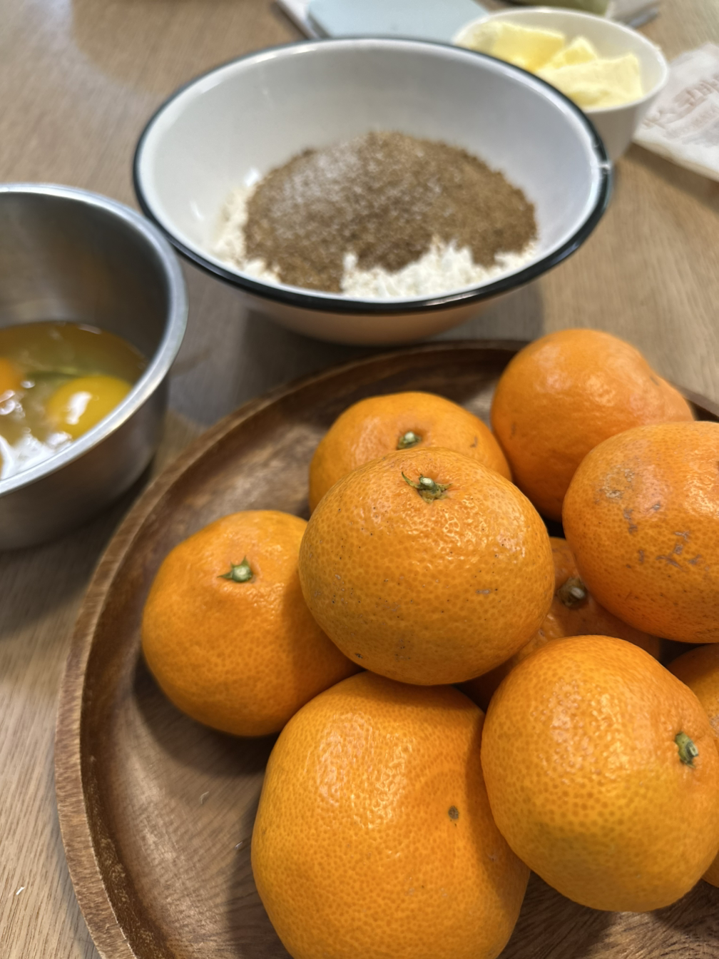 귤을 15개 남짓 넉넉하게 까서 반죽에 넣을 과육 따로 즙 따로 만들어두고 가루류와 상온에 꺼내 둔 버터, 계란을 섞어준다. 다른 재료들은 평범하지만 귤이 맛있어야 하는 것은 기본, 시트러스 계열의 재료를 넣을 때는 레몬즙도 첨가해 깔끔한 끝맛을 만들어주는 것이 팁이다.