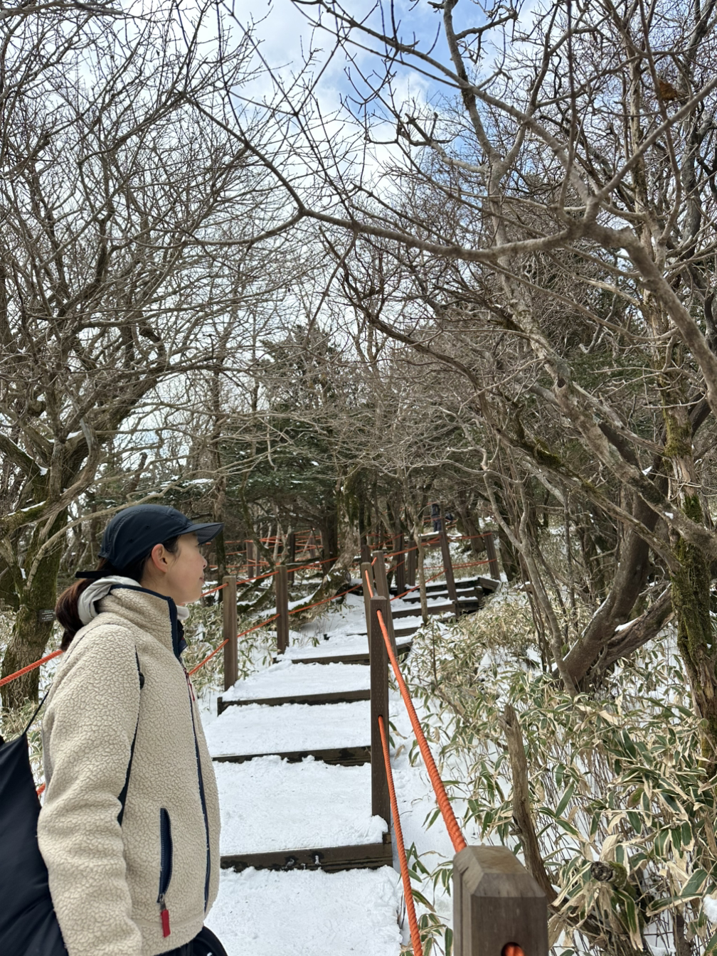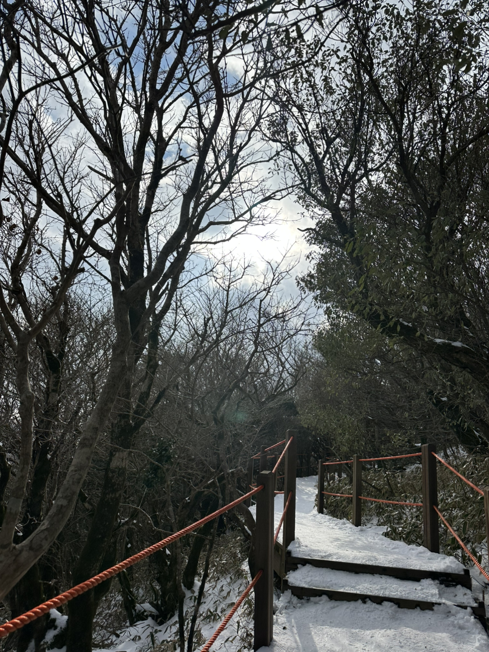 상고대가 펼쳐진 풍경은 아니었지만 아직 녹지 않은 눈 덕분에 아이의 하얀 웃음을 많이 볼 수 있었다. 어렵지 않은 코스지만 눈길이라 조심조심 걸었다. 아이젠을 준비 못한 가족이 줄을 붙잡고 엉거주춤 내려오시길래 먼저 지나가길 기다리고 서있었다. 본인도 미끄러울 텐데 눈길에 발자국을 파며 딸에게 아빠가 밟은데 밟으라고 앞서 내려와 주시는 모습에 내 마음이 다 따뜻해졌다.