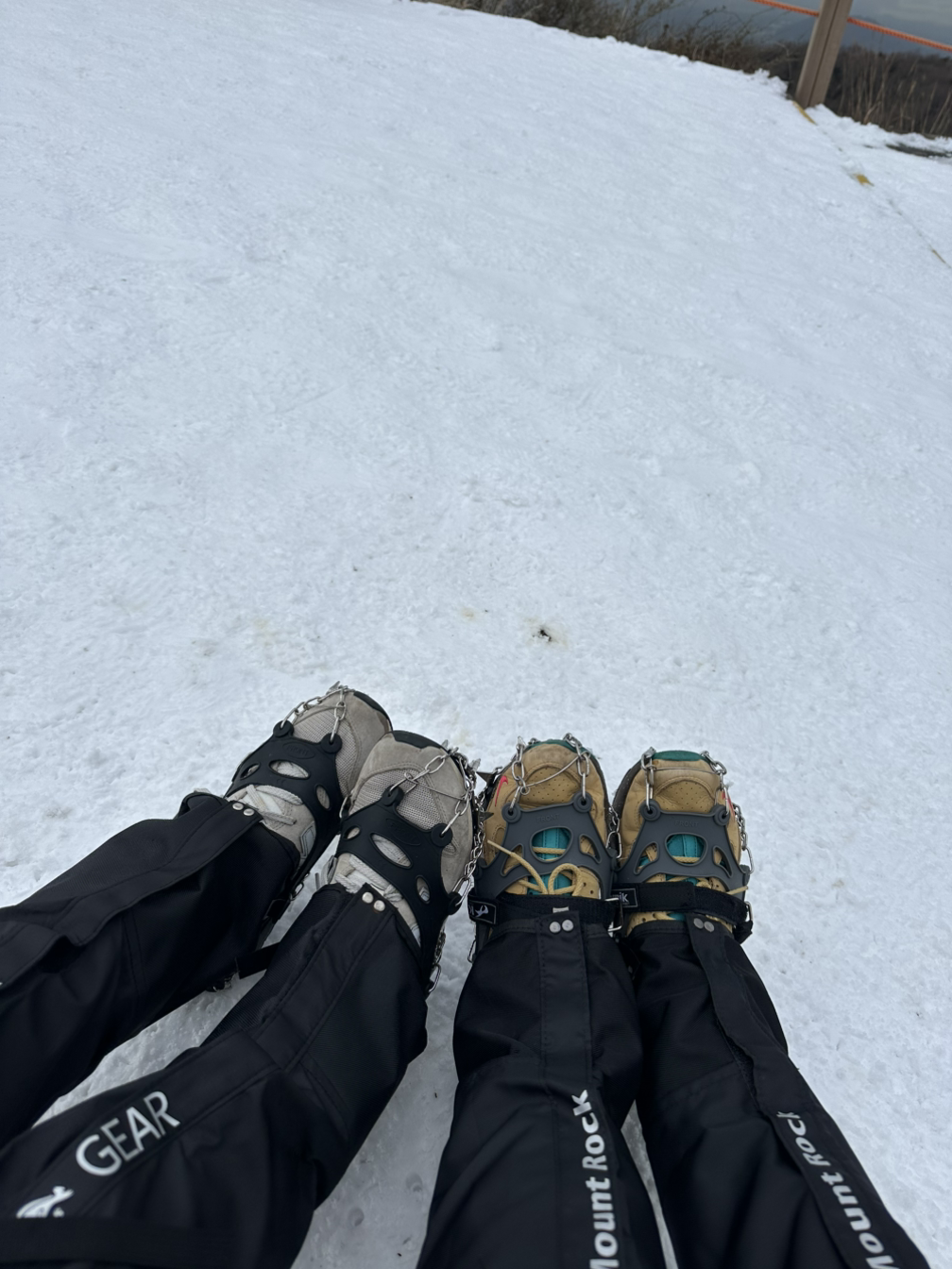 한 겨울이 되어 한라산이 하얗게 옷을 갈아입고 있으면 우리 집 강아지들은 눈놀이가 하고 싶어 안달이다. 오랜만에 큰 아이와 둘만의 시간이 주어져 김밥과 간식을 챙겨 어리목주차장으로 달려갔다. 차갑고 깨끗한 공기에 눈이 떠지고 눈꽃이 핀 설산을 보고 마음이 열렸다. 어승생악 탐방로에 아직 남아있는 눈 때문에 미끄러울 수 있으니 아이젠을 차고 오르기 시작했다. 장비를 차니 마음껏 눈에서 뛰어놀 수 있단 생각에 아이는 들떴다.
