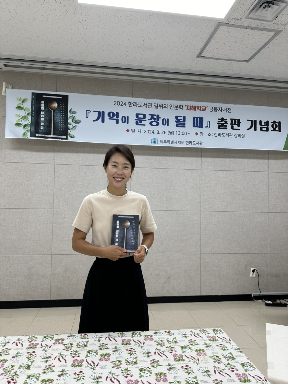 바다수영 선배들이 한수풀해녀학교에 입학했다는 소문을 듣고 나도 언젠가 입학하겠다는 먼 꿈을 꾸었고 학교 앞바다에서 열린 바다수영대회를 2년째 완주하며 그 꿈이 현실로 다가왔음을 직감했다. 두 딸에게 내 한계를 넘어 도전하는 모습을 보여주고 싶었고 스스로와 싸우며 2km를 헤엄친 27분은 그동안 잠들어있던 내 이름 세 글자가 귀덕리에 울려 퍼지는 듯 기뻤다. 매주 곽지에서 한담까지 장거리수영으로 체력을 기르고 프리다이빙 AIDA1 자격증을 취득한 '엄마고래'는 '기억이 문장이 될 때'라는 공동자서전에 바다와 함께 살아가는 이야기를 담아 첫 출간의 희열을 느꼈다.