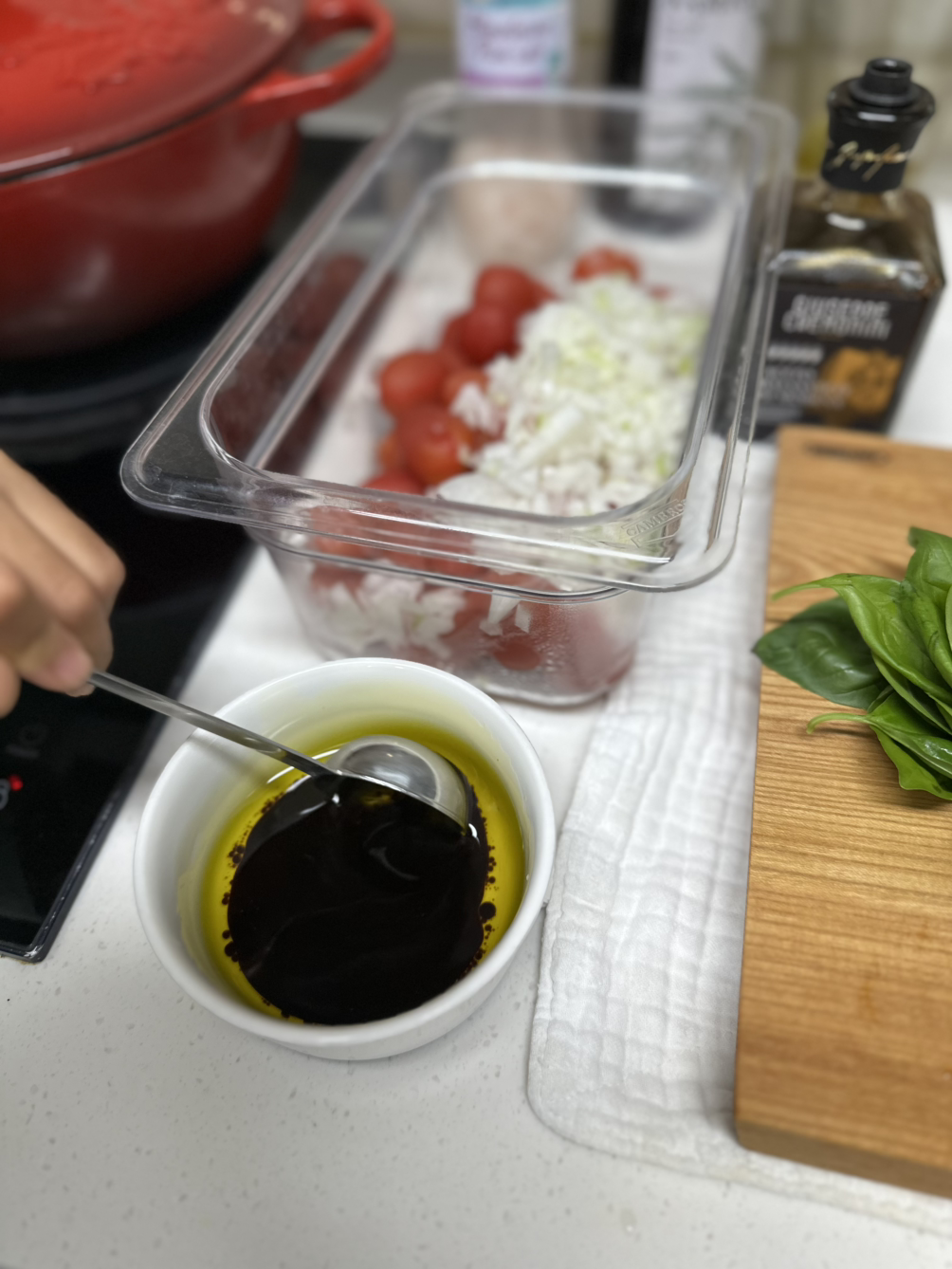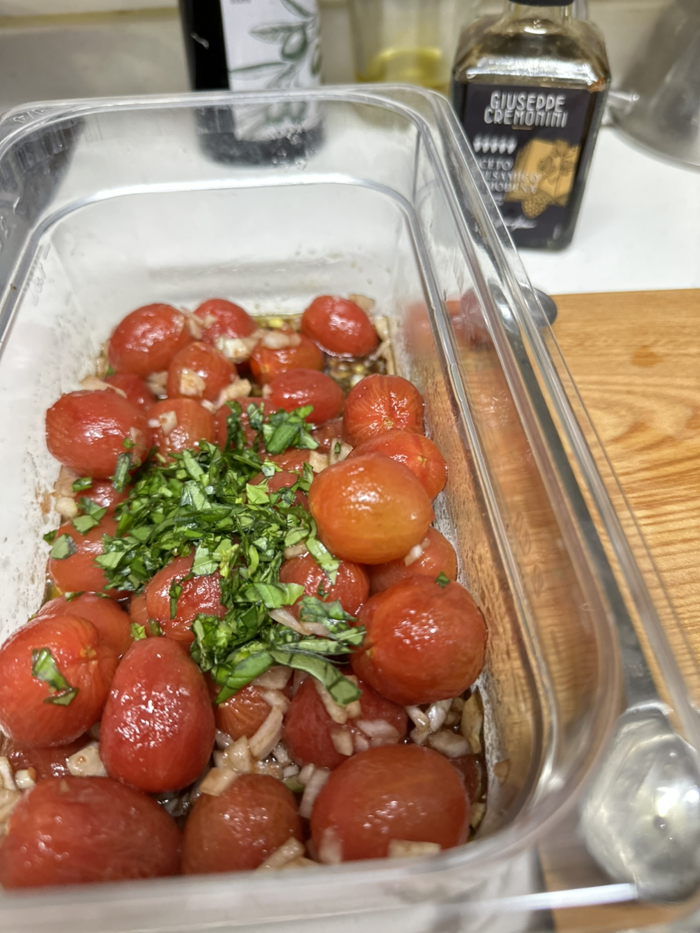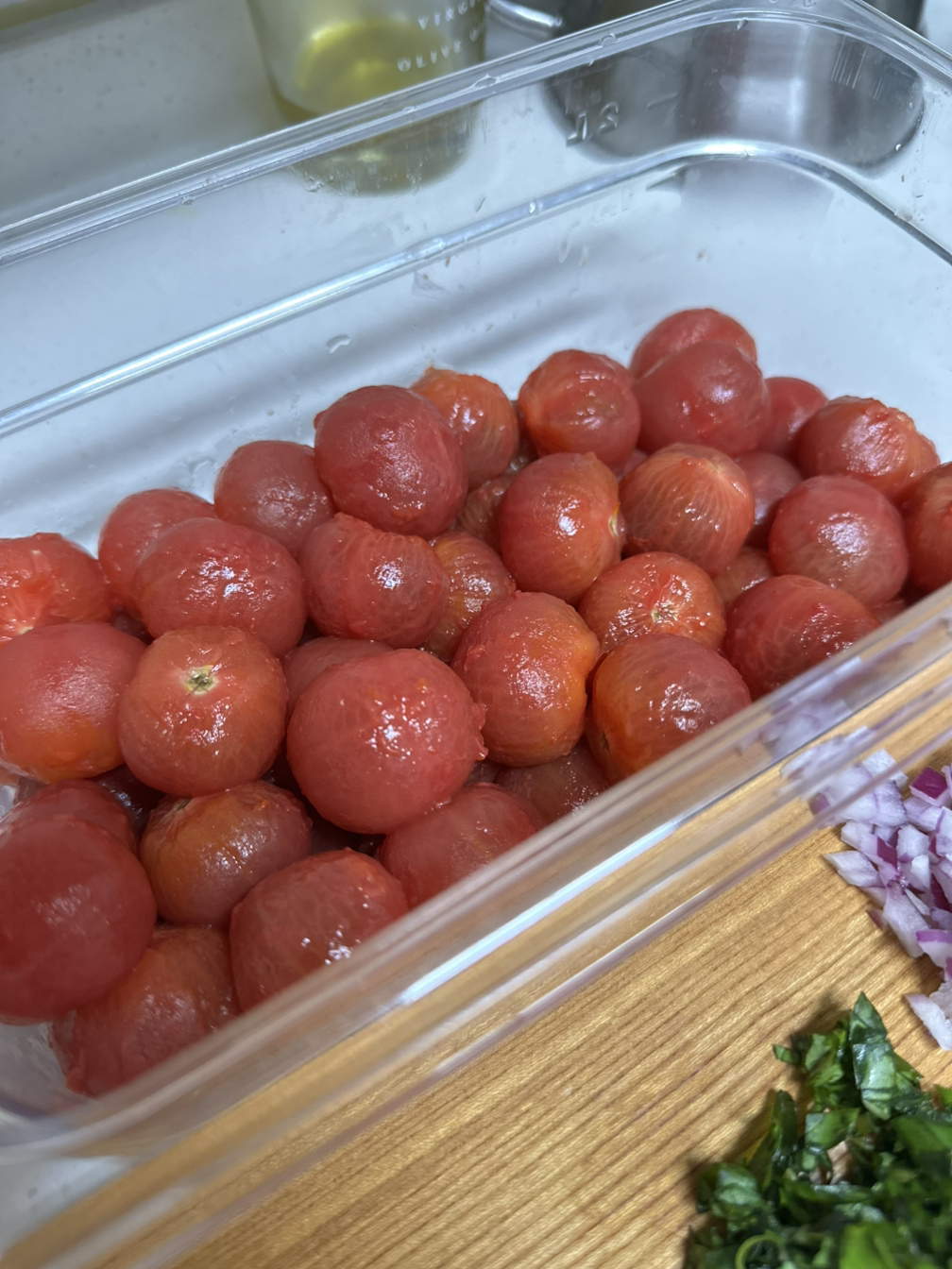 마리네이드 할 때 올리브오일과 발사믹식초가 들어가고 토마토에서 나오는 과즙이 생기기 때문에 데친 후 남아있는 물기는 키친타월로 없애줘야 깊은 맛이 난다.