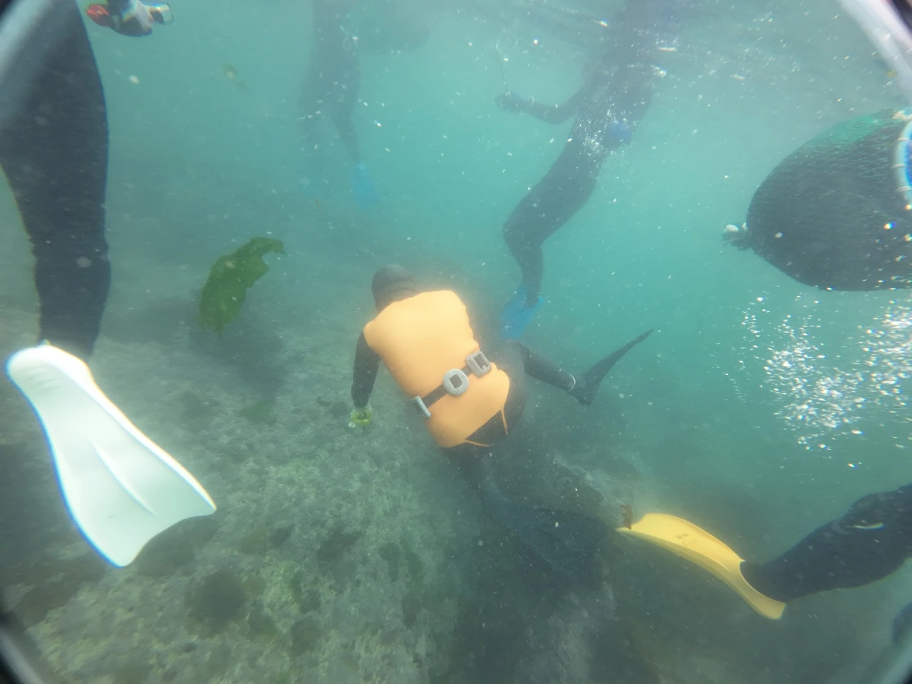 윽, 가만히 있어도 추운데 차가운 바닷물에 다시 몸을 담그니 참 적응이 안 됐다. 슈트 안으로 물을 넣고 계속 헤엄쳐야 몸이 찬물에 적응하기 때문에 해녀상이 있는 곳까지 힘차게 발을 찼다.