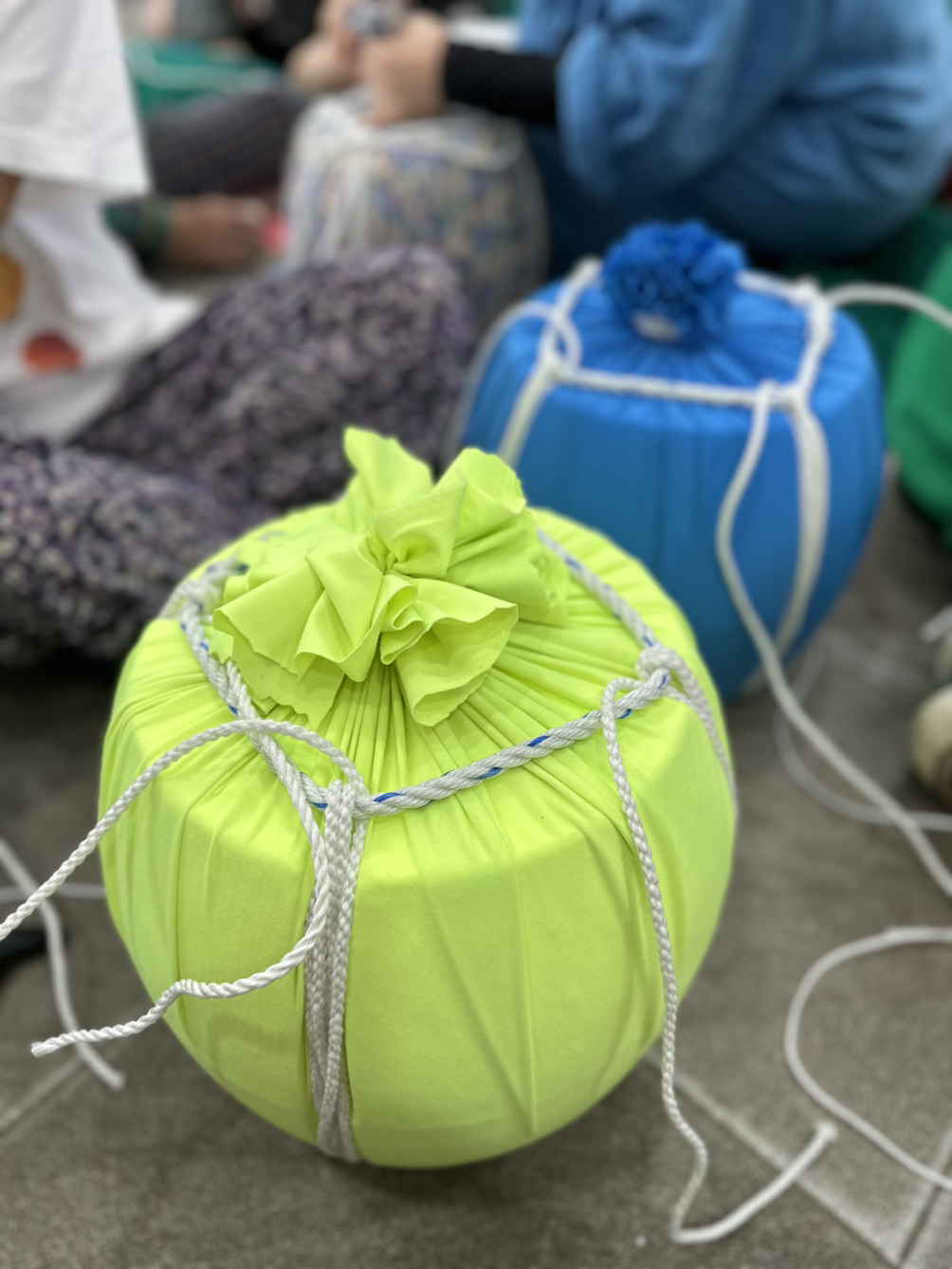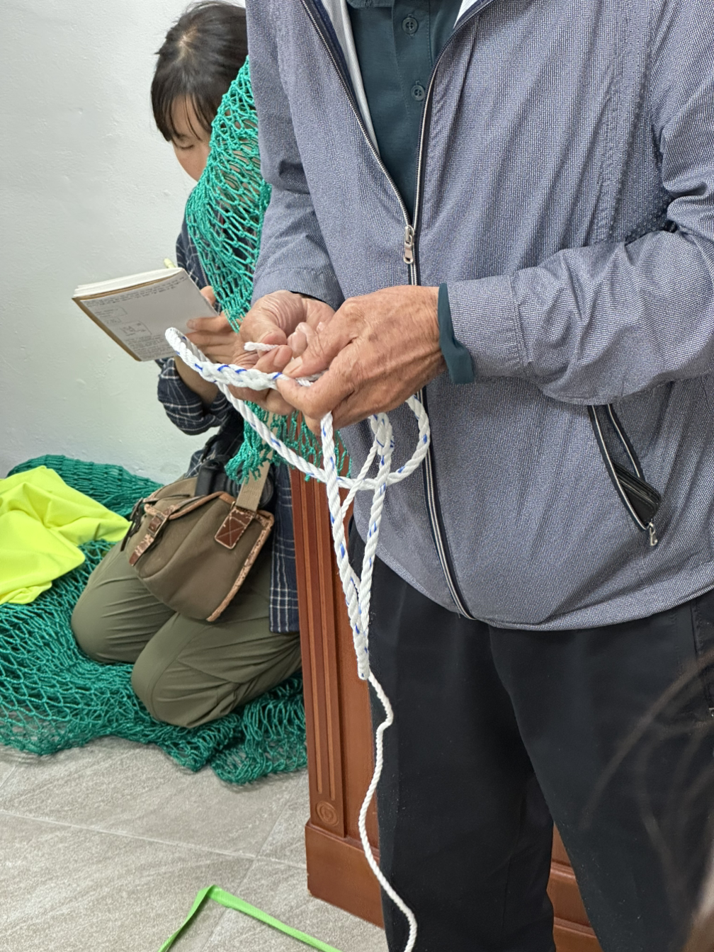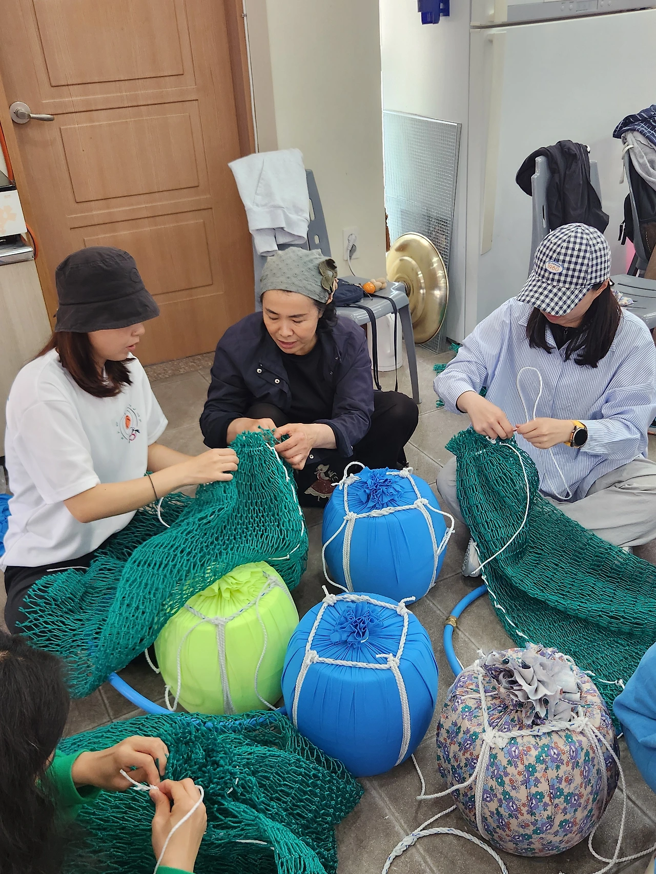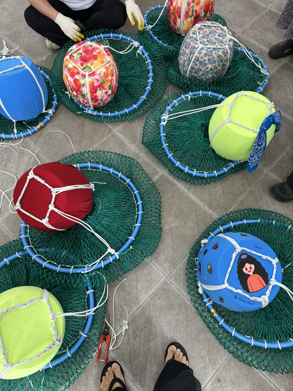 각자 집에서 챙겨 온 천으로 부표 부분을 감싸고 망사리와 이을 수 있도록 매듭을 또 만들었다.