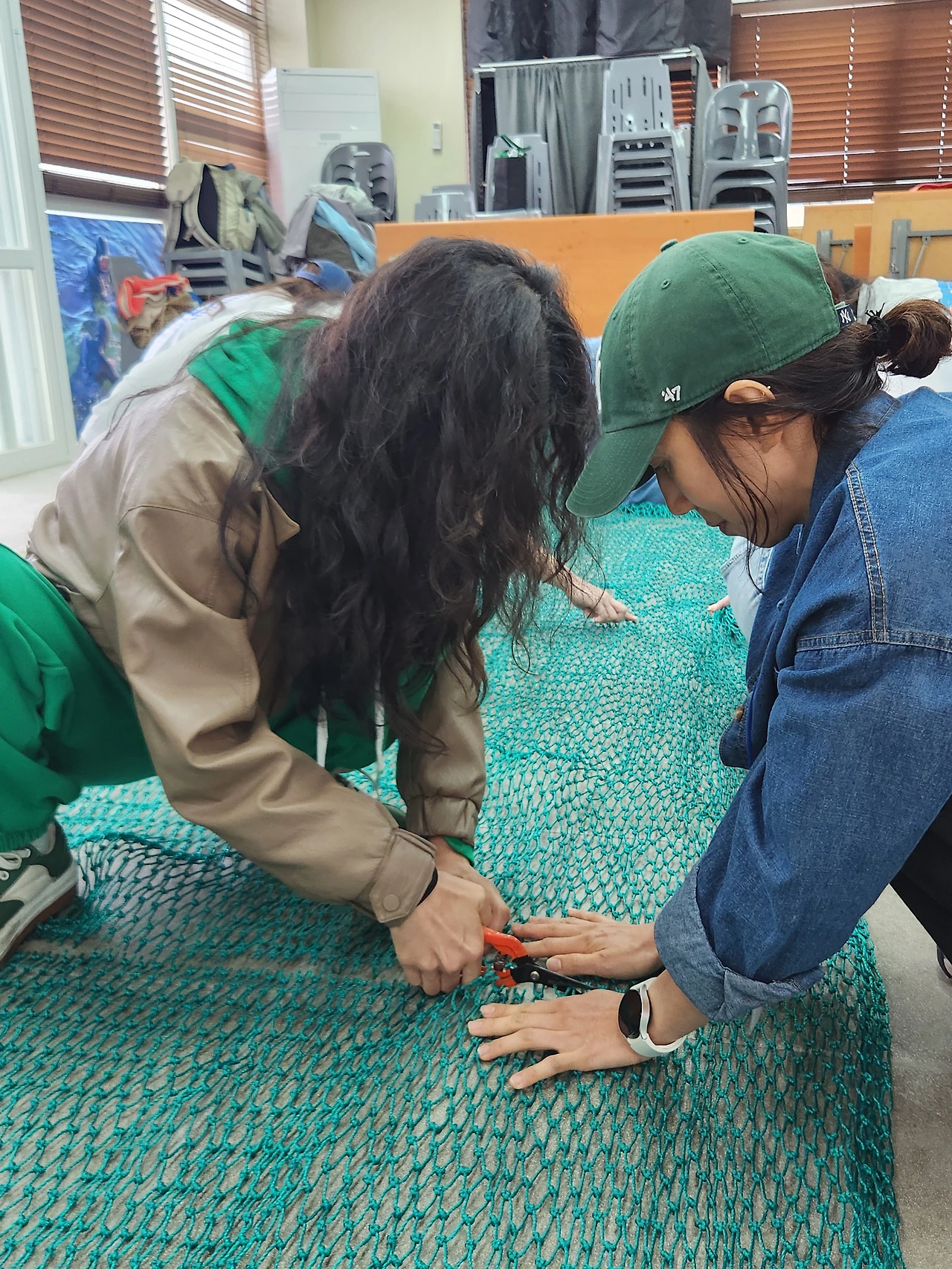 초록색 망사리를 넓게 펴 한 개의 테왁에 들어갈 만큼 잘라주고 실 역할을 할 얇은 끈으로 엮어주었다. 망사리를 반으로 접어 바느질하듯 두 칸에 한 번씩 방향을 바꿔 이어 주어 큰 원통모양의 주머니가 완성됐다.
