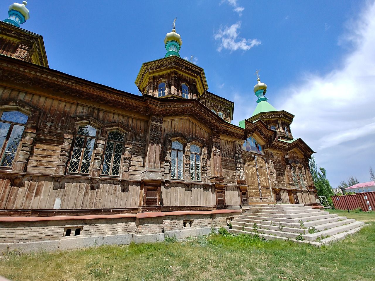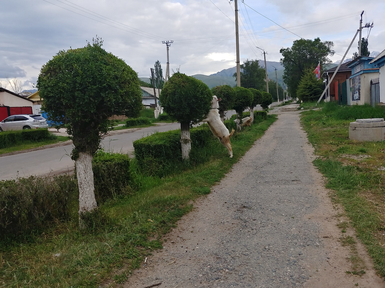 카라콜은 작은 도시다. 도시 자체로는 볼 게 별로 없다. 도시보다는 근처의 트래킹 코스의 베이스캠프 역할로 관광객을 모은다. 정교회 성당같이 시내 중심부의 옛날 건물과 공원 몇 군데를 둘러보면 할 게 없다. 시내 중심부지만 포장이 벗겨진 도로 위로 자동차와 말이 끄는 수레, 사람들이 뒤엉켜 지난다. 흙먼지가 나는 번잡한 도로를 지나면 염소들이 풀을 뜯는 한적한 주택가가 나온다. 파란 칠을 한 대문과 파란 지붕을 인 집들을 지나쳤다.