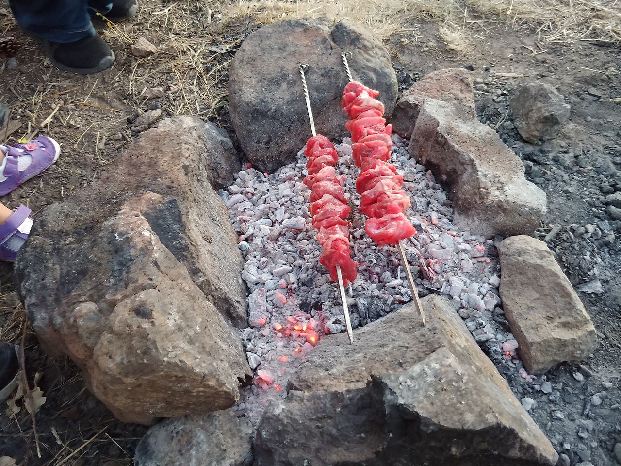 초룸은 고도가 있는 곳이라 해질녘이 되니 으슬해지기 시작했다. 가방에서 얇은 점퍼를 꺼내 걸쳤다. 화덕의 불이 자꾸 꺼지는 바람에 번갈아가며 끊임없이 부채질을 해줘야 했다. 화덕 앞에서 난리를 피우는 동안 이미 해는 져버리고, 결국 우리는 휴대폰 불빛에 의지해 밥을 먹어야 했다. 그래도 불에 구운 고기는 뭐든지 다 맛있다. 설령 그게 뭔지 안 보이더라도.