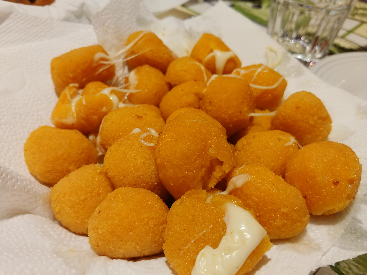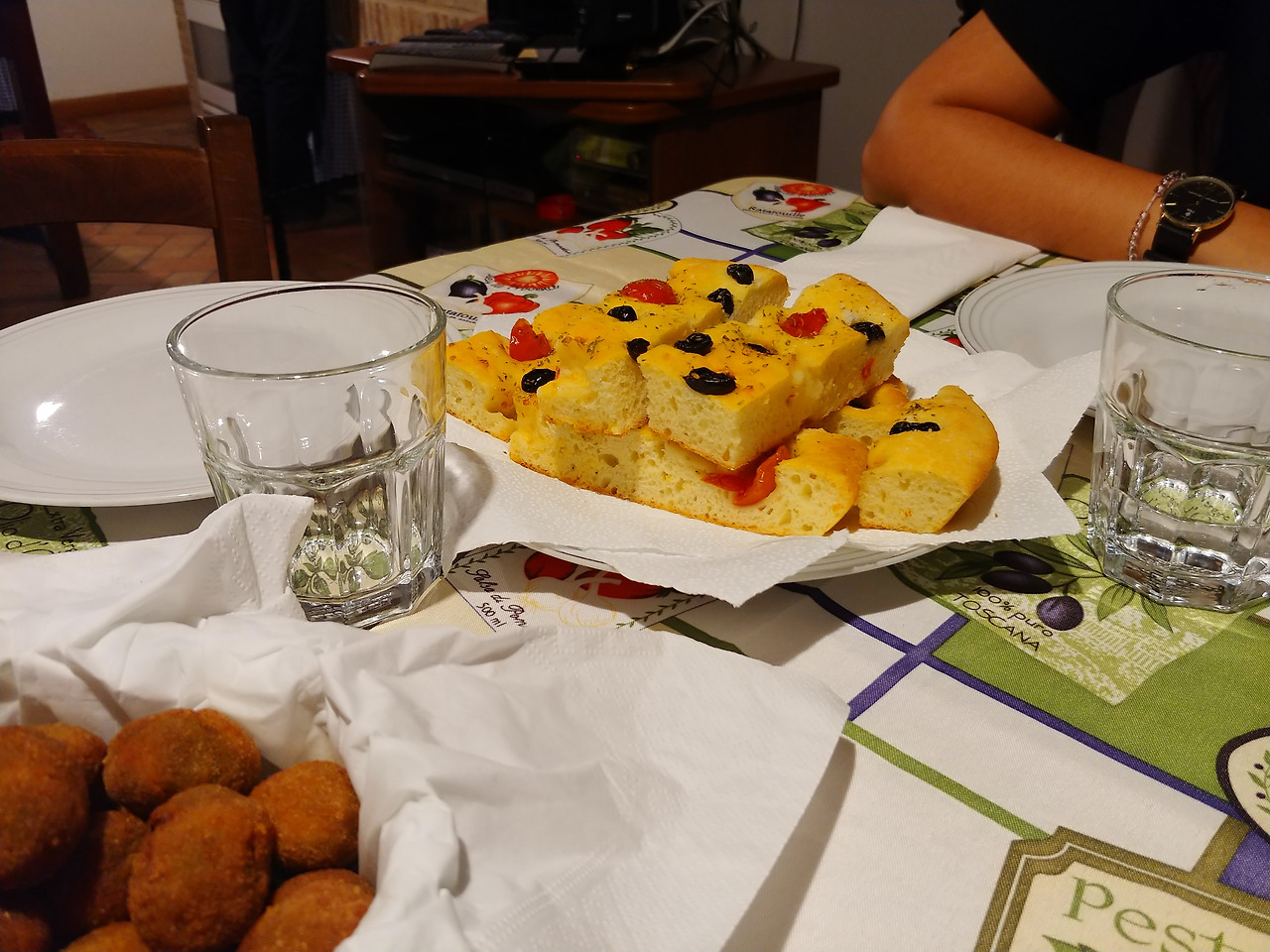 집에 돌아갔을 때 부모님께서는 부엌에서 음식을 만들고 상을 차리신다고 분주하셨다. 부엌에 있는 화덕에 불을 땠는지 집이 따뜻했다. 우리가 아페테리프를 마시고 있을 동안 아버지께서 화덕에서 갓 구운 피자를 꺼내 주셨다. 곧이어 어머니의 요리가 나오고 감자, 모짜렐라, 올리브, 햄, 아티초크 등 갖가지 재료들이 들어간 모둠 튀김을 먹느라 우리는 부지런히 포크를 움직였다.