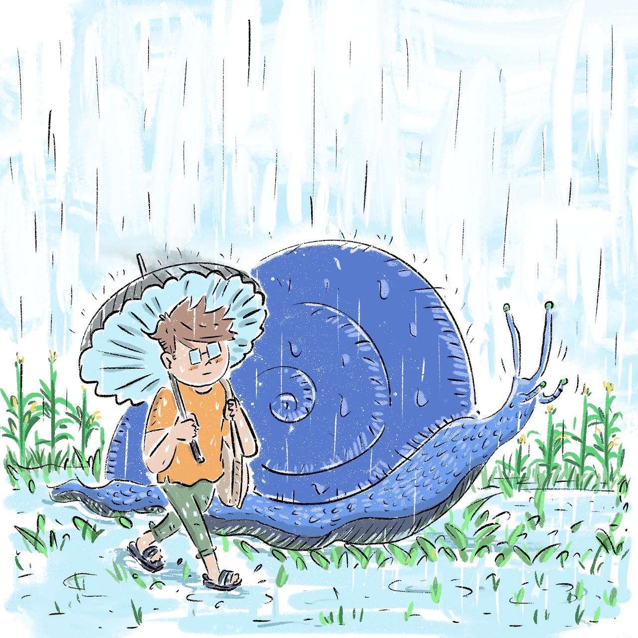 느린 걸음으로 빗속을 천천히 걷는다.