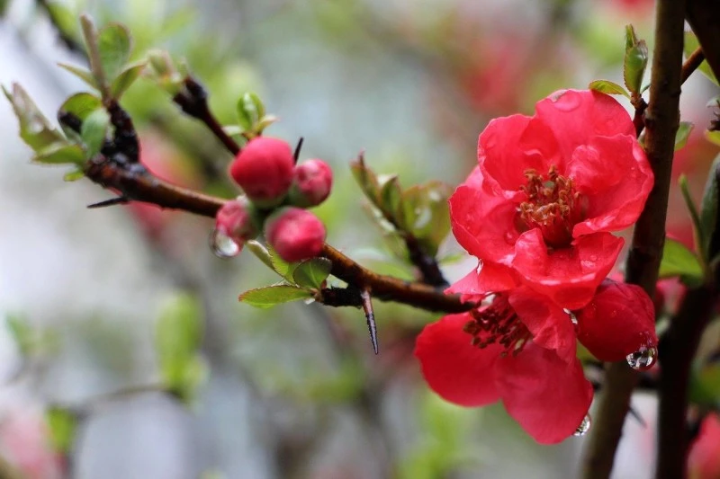 **명자나무 : 산당화, 명자꽃이라고도 하며, 중국 원산으로 오랫동안 관상용으로 심어 왔다. 높이 2m 내외에 달하고 가지 끝이 가시로 변한 것이 있다. 잎은 어긋나고 타원형이며 양 끝이 좁아지고 가장자리에 톱니가 있으며 턱잎은 일찍 떨어진다. [네이버 지식백과] 명자나무 [Japnese Quince] (두산백과)