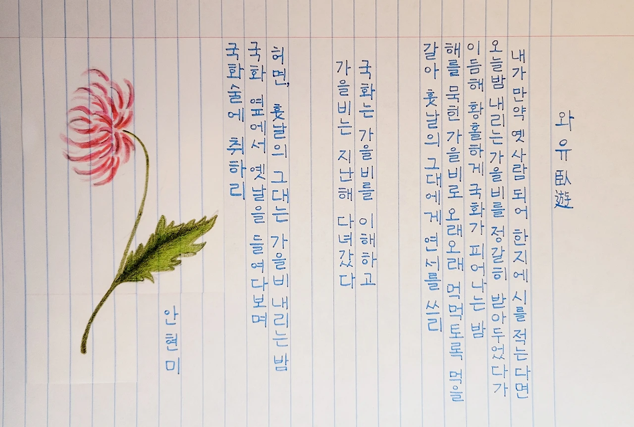 내가 만약 옛사람 되어 한지에 시를 적는다면 오늘 밤 내리는 가을비를 정갈 히 받아두었다가 이듬해 황홀하게 국화가 피어나는 밤 해를 묵힌 가을비로 오 래오래 먹먹토록 먹을 갈아 훗날의 그대에게 연서를 쓰리 ' 국화는 가을비를 이해하고 가을비는 지난해 다녀갔다 ' 허면, 훗날의 그대는 가을비 내리는 밤 국화 옆에서 옛날을 들여다보며 홀로 국화술에 취하리