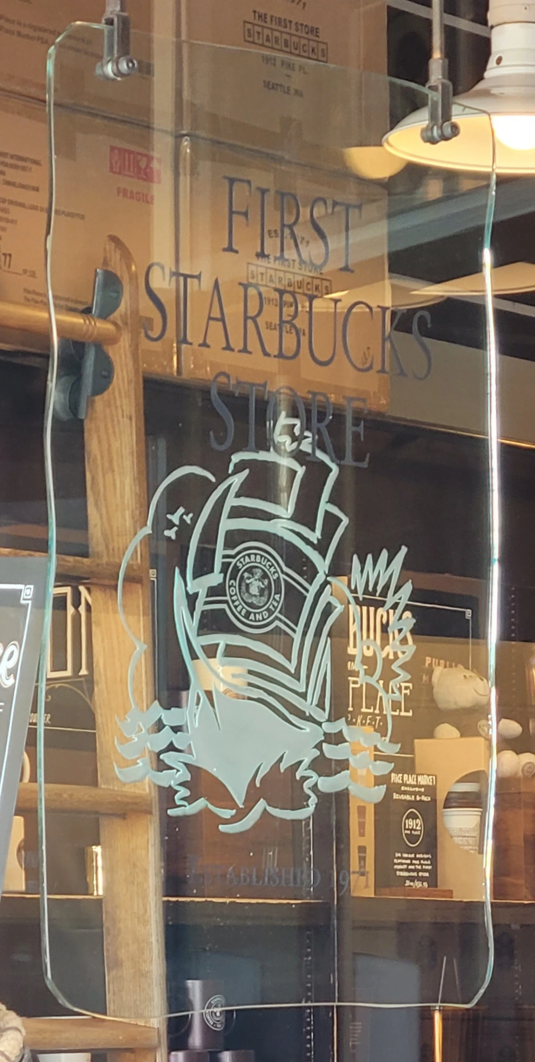시애틀의 하루는 바다와 더불어 커피와 더불어 시작하는 것이라고. 가까이 컨테이너를 잔뜩 실은 무지막지한 배가 장난감 배처럼 바다에 떠있는 것이 보였다. 1호점 스타벅스는 우리말로 두 평쯤 되는 가게랄까.