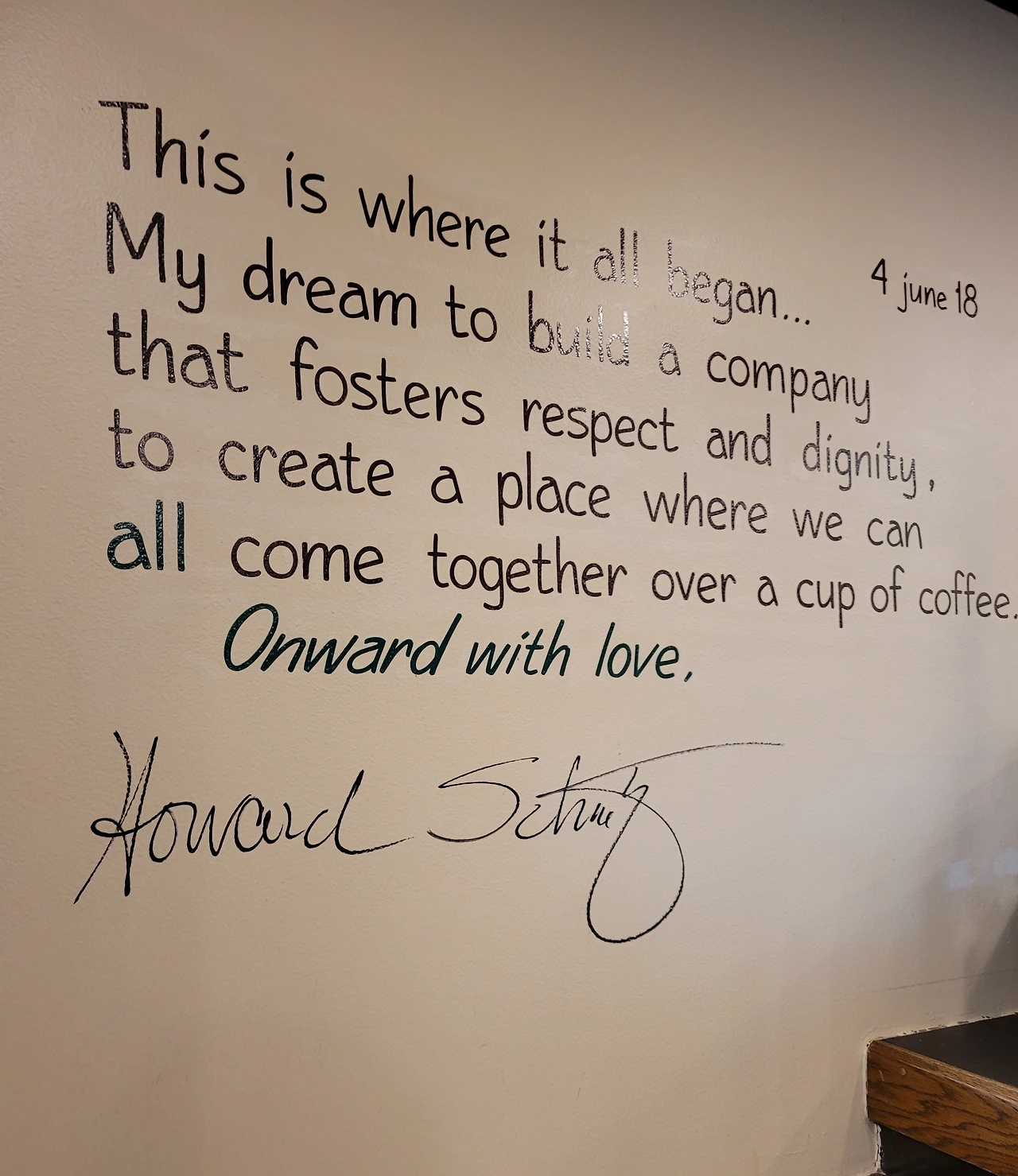 여기서 시작한 스타벅스를 세계적인 커피 회사로 키운 사나이, 하워드 슐츠의 첫 생각과 사인이 가게 한쪽 벽에 적혀 있었다.