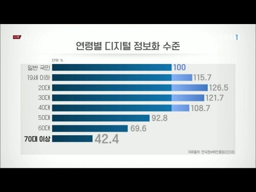 이분남씨처럼 우리나라엔 무인주문기 같은 디지털 시스템을 이용하기 어려워하는 '디지털 소외 계층'이 많다. 2018년 한국정보화진흥원에서 발표한 '디지털 정보격차 실태조사'에 따르면 일반 국민을 100으로 보았을 때, 70대 이상의 디지털정보화활용 수준은 42.4%에 불과하다. 노인들에게 공인인증서, 백업, 업데이트 등 디지털의 장벽이 높을 따름이다.