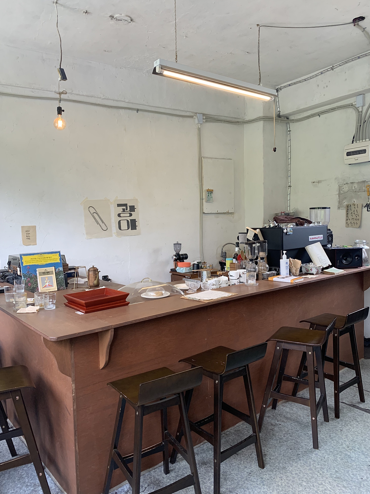알루미늄 문 앞에 도착할 때쯤, 보통의 현대인이라면 숨이 살짝 거칠어져 있을 것이다. 이 거친 숨을 달래며 손잡이를 밀면, 전축 사운드로 음악이 들리기 시작한다. 그간의 내 경험으론 음악 장르 비율은 클래식이 60%, 옛 가요(김광석, 이문세, 015B, 낯선 사람들, 이소라)가 30%, 올드 재즈가 10% 정도였다.