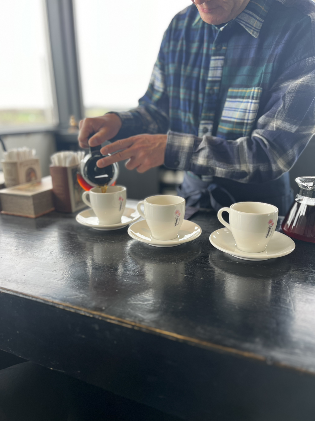입구로 들어가니 신발을 벗어 두고 2층으로 올라오라는 안내문이 있다. 벌레가 들어왔다가 놀라서 나갈법한 깔끔한 실내 계단을 따라 2층에 올라가니, 인상 깊은 차림의 사장님이 우리를 반겨주신다. 아마도 창문으로 한참 전부터 보인 렌터카를 보고 우리가 이곳에 올 것을 알고 계셨을 듯하다. 시원한 생수와 함께 메뉴를 설명해 주셔서 진지한 고민을 짧게 하고, 각자의 커피를 골라 주문을 마쳤다. 사장님이 커피를 내리는 장면은 너무나 연극적이라 떠들지도 않고 집중해 보게 되었는데, 곧 코를 황홀하게 하는 커피 향이 끝내주는 뷰를 자랑하는 카페 공간을 가득 채웠다.