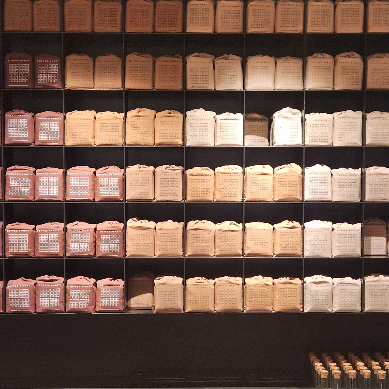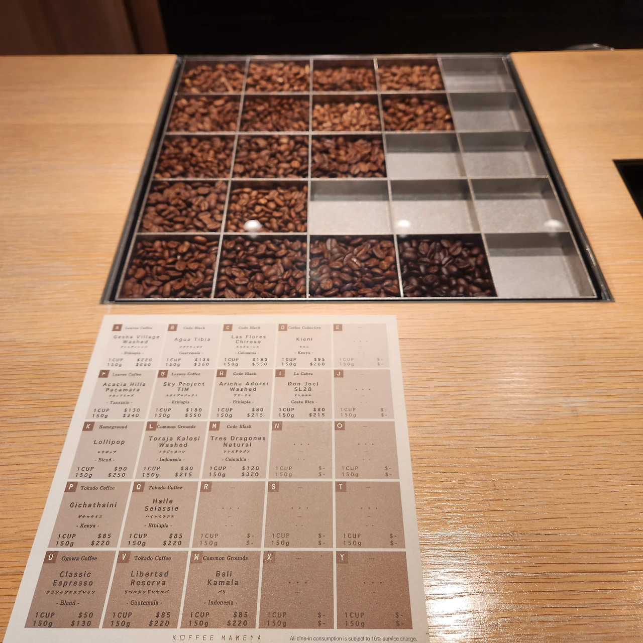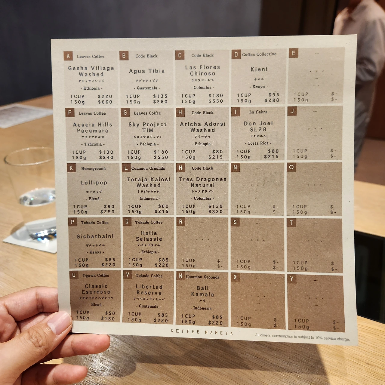 메뉴판은 정말 독특하다. 하얀색에서 갈색으로 점점 짙어지는 메뉴판은 로스팅정도를 나타낸다. 비싼 메뉴는 220$짜리도 있다. 커피 한잔에 37,400원. 어마어마한 가격이다. 아무리 게이샤 커피라도 그렇지 그 돈을 주고 먹고 싶은 생각은 없다. 메뉴판을 열심히 읽어보니 가장 저렴한 가격대는 80$, 즉 13,600원정도. 한잔은 아이스, 한잔은 따뜻한 걸로 주문했다. 메뉴판에 적혀있는 가격은 어떻게 주문하던 동일한 80$짜리 가격이다. 드립이던, 에스프레소던, 아이스던, 핫이던 동일한 것으로 보인다. 그러나 서비스료가 10%부과되니 참고하시길.