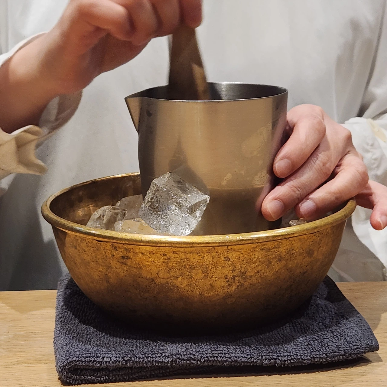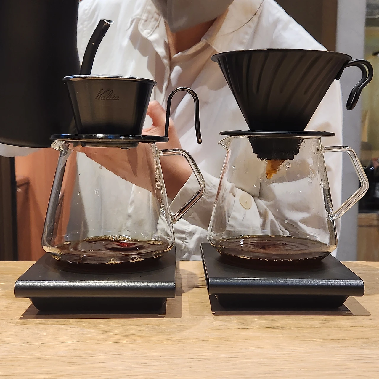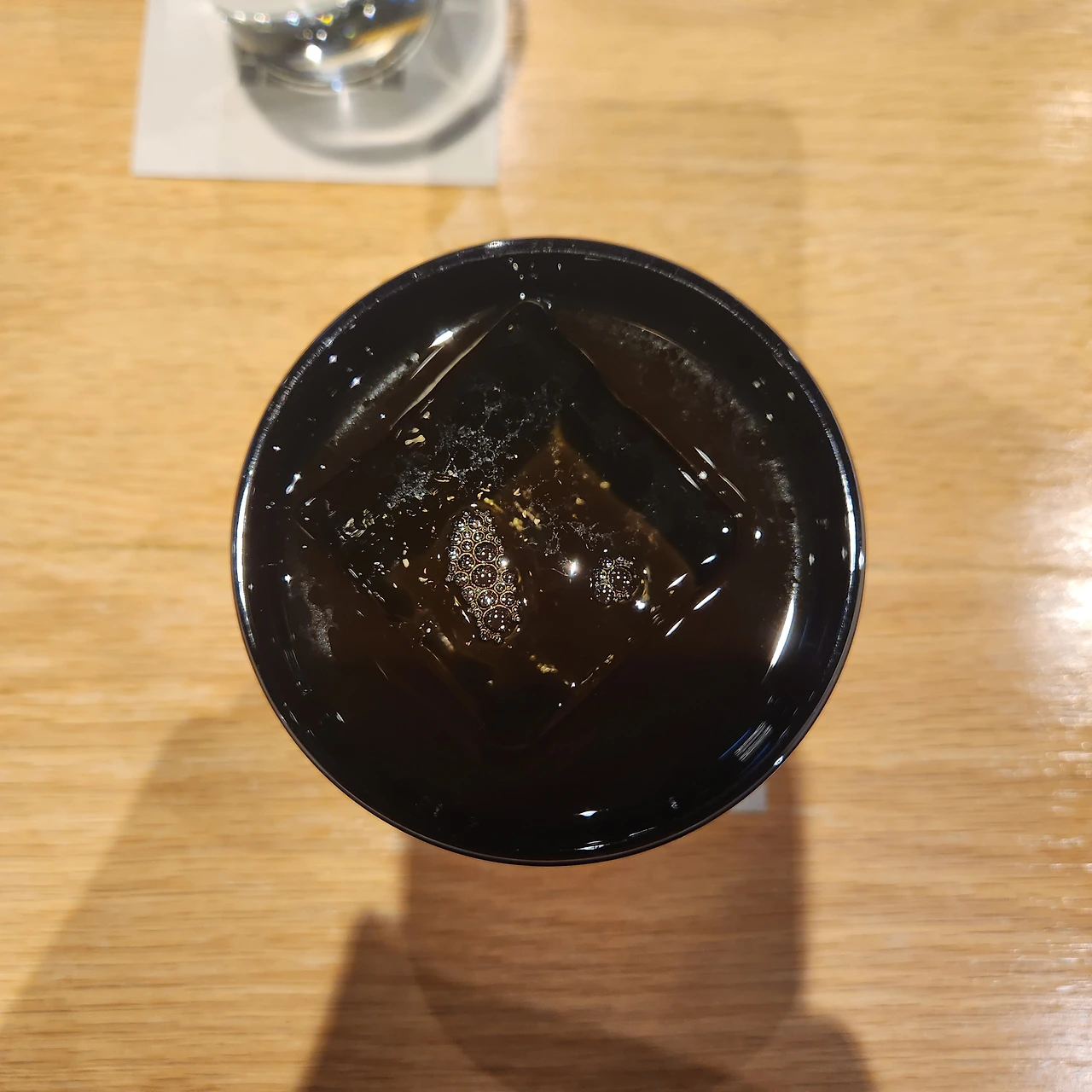 드립 커피를 두 잔 동시에 내린다. 아이스는 조금 더 작은 드리퍼를 쓰는 듯 싶다. 어쩌면 원두의 차이일지도. 우리는 에티오피아 아리차, 코스타리카 돈 조엘을 주문했다. 원두를 말코닉으로 분쇄하고서 시향을 시켜준다. 이후 드립을 내리고 뜨거운 음료 먼저 제공한다. 아이스 음료는 작은 잔에 조금 따라서 시음을 권하고 바 안쪽으로 들어갔다. 뇟쇠 같은 그릇에 얼음을 가득 담고서 스테인리스 통을 담근다. 그리고 그 안에 드립 커피를 붓는다. 한참을 얼음으로 칠링하더니 손등에 커피를 한방울 흘려서 온도를 체크한다. 그리고 검은색 잔에 정사각형의 투명한 얼음을 넣고 커피를 담는다. 마치 바에서 비싼 위스키를 한잔 시킨 것 같은 기분을 준다.