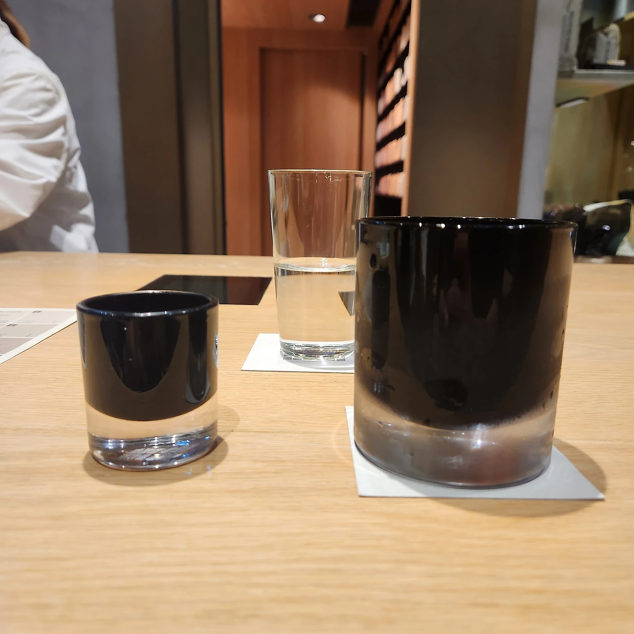커피는 맛있었다. 아리차는 상큼하면서 티처럼 깔끔했고 코스타리카 돈 조엘은 벨런스가 잡힌 단 맛이 좋았다. 묵직한 컵의 감촉과 조명을 받아서 투명하게 빛나는 얼음이 기분을 시원하게 만들었다. 아쉬운 점이 있다면 잔이 투명하지 않아서 커피의 색을 보지못하는 점 정도. 커피를 마시면서 중간 중간 바리스타가 콜드브루를 작은 잔에 따라서 시음을 시켜줬다. 같은 원두를 다르게 추출한 커피가 어떤 느낌인지 알려주고 싶으셨는 듯 하다.