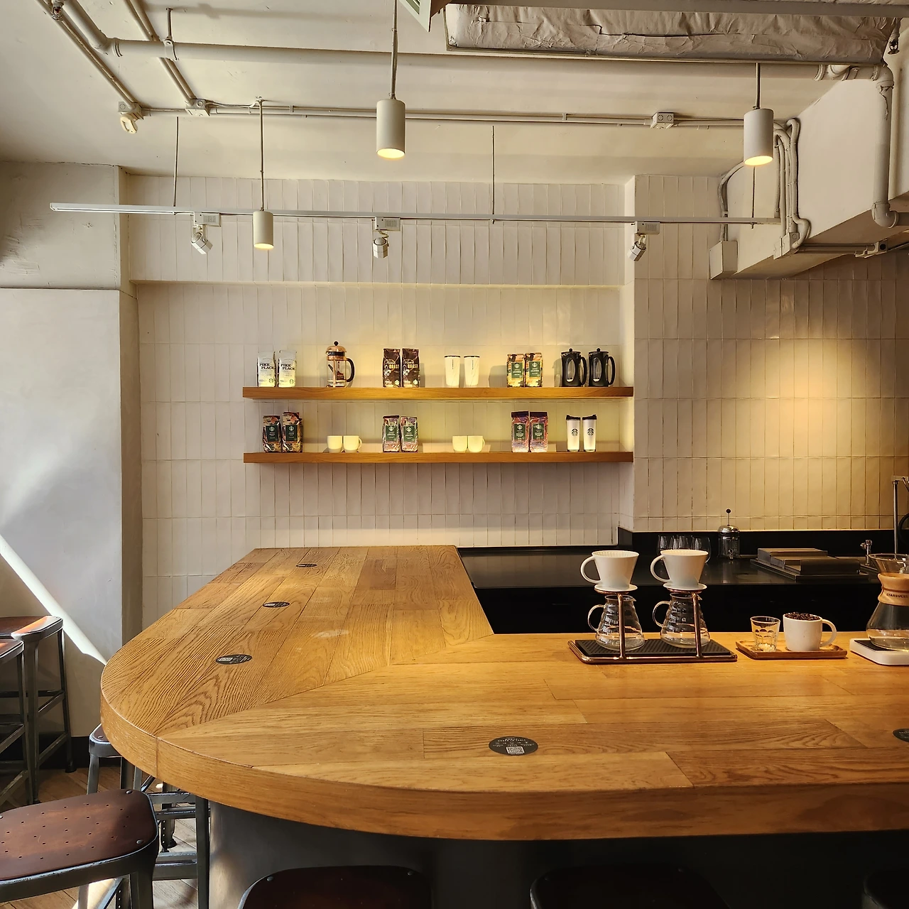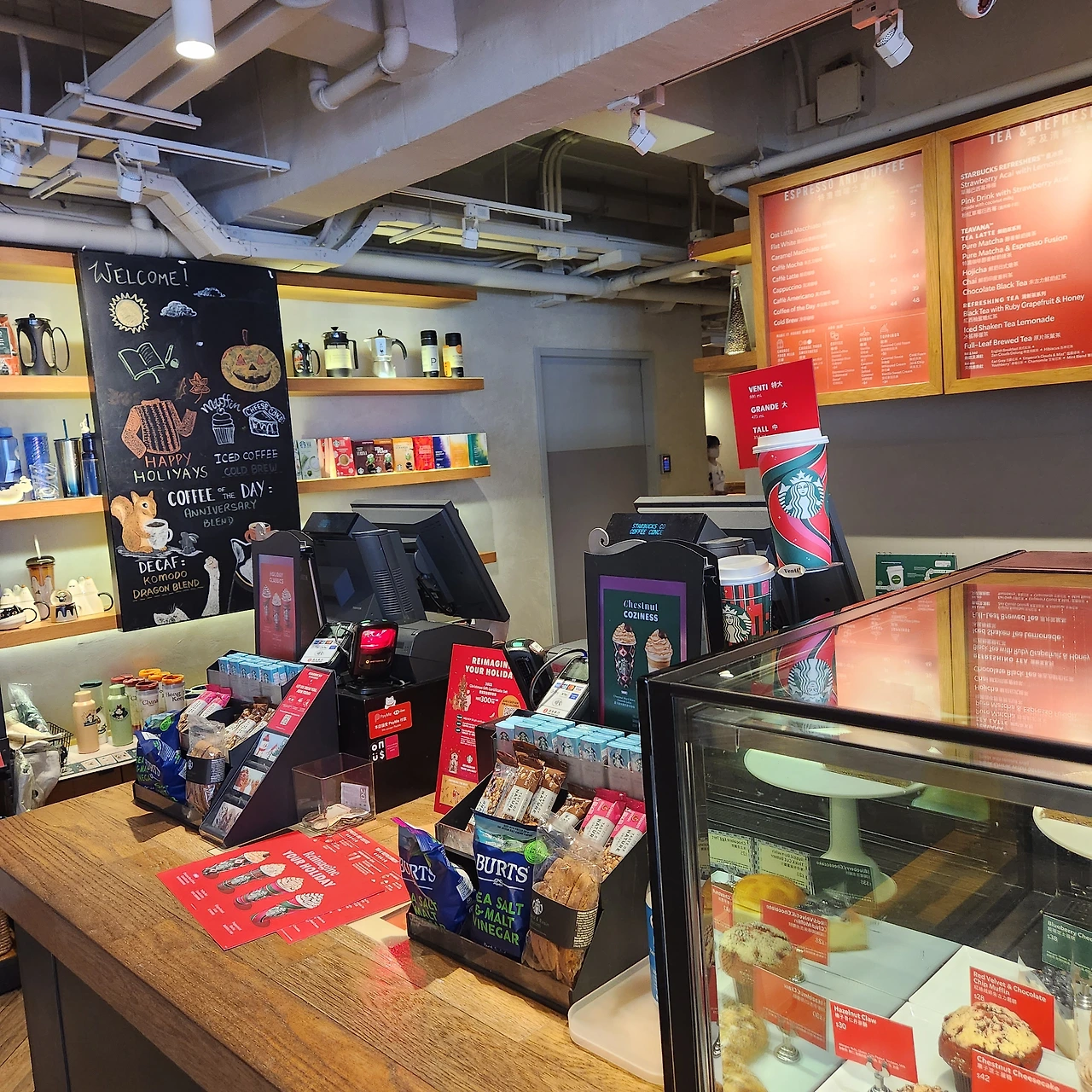 스타벅스 코리아는 어딜 가나 같은 인상을 주기 위해서 같은 동선을 유지한다. 바로 마실 수 있는 병음료(RTD), 샌드위치, 케이크가 진열된 푸드 쇼케이스, 그리고 바로 뜯어서 먹을 수 있는 봉투에 든 스낵(그랩&고)을 지나면 주문을 받는 포스기가 있다. 그다음엔 에스프레소 머신을 지나 커피를 건네주는 핸드오프 테이블. 그 뒤에는 커피를 기다리면서 볼 수 있는 MD 진열장. 홍콩의 스타벅스도 유사했다. 그러나 내가 방문한 곳은 살짝 달랐다. 리저브 매장도 아닌데 바가 하나 더 있었다. 게다가 포스와 커피 머신이 동떨어져 있었다.